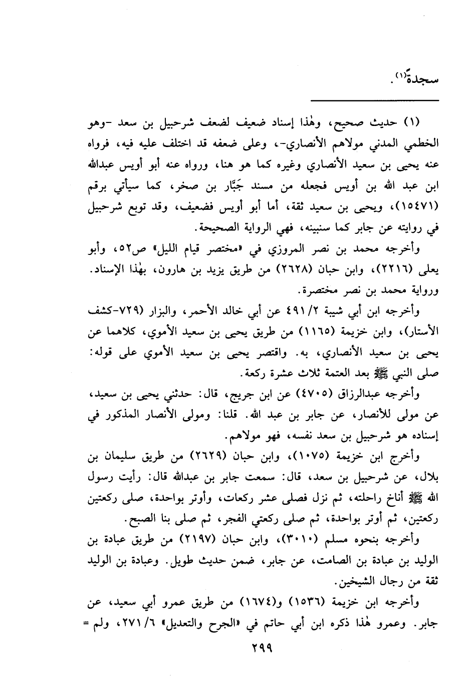 وأخرج ابن خزيمة (١٠٧٥) ، وابن حبان (٢٦٢٩) من طريق سليمان بن بلال، عن شرحبيل بن سعد، قال: سمعت جابر بن عبد الله قال: رأيت رسول الله صَلَّى اللهُ عَلَيْهِ وَسَلَّمَ أناخ راحلته، ثم نزل فصلى عشر ركعات، وأوتر بواحدة، صلى ركعتين ركعتين، ثم أوتر بواحدة، ثم صلى ركعتي الفجر، ثم صلى بنا الصبح.