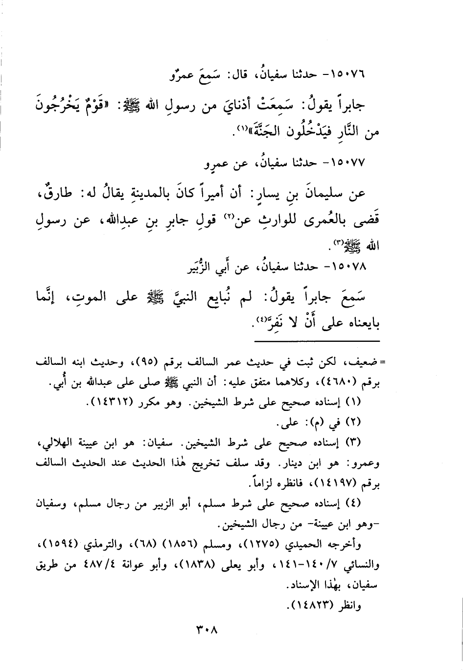 ١٥٠٧٦ - حَدَّثَنَا سُفْيَانُ، قَالَ: سَمِعَ عَمْرٌو، جَابِرًا، يَقُولُ: سَمِعَتْ أُذُنَايَ، مِنْ رَسُولِ اللهِ صَلَّى اللهُ عَلَيْهِ وَسَلَّمَ: " قَوْمٌ يَخْرُجُونَ مِنَ النَّارِ، فَيَدْخُلُونَ الْجَنَّةَ " (١)