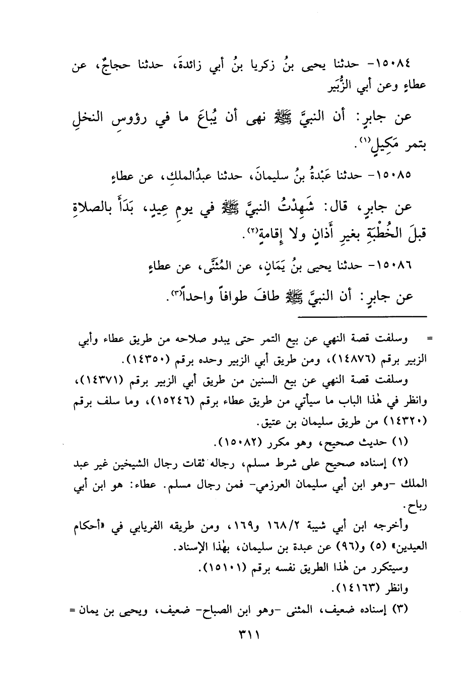 ١٥٠٨٤ - حَدَّثَنَا يَحْيَى بْنُ زَكَرِيَّا بْنِ أَبِي زَائِدَةَ، حَدَّثَنَا حَجَّاجٌ، عَنْ عَطَاءٍ، وَعَنْ أَبِي الزُّبَيْرِ، عَنْ جَابِرٍ، " أَنَّ النَّبِيَّ صَلَّى اللهُ عَلَيْهِ وَسَلَّمَ نَهَى أَنْ يُبَاعَ مَا فِي رُءُوسِ النَّخْلِ بِتَمْرٍ مَكِيلٍ " (١)
