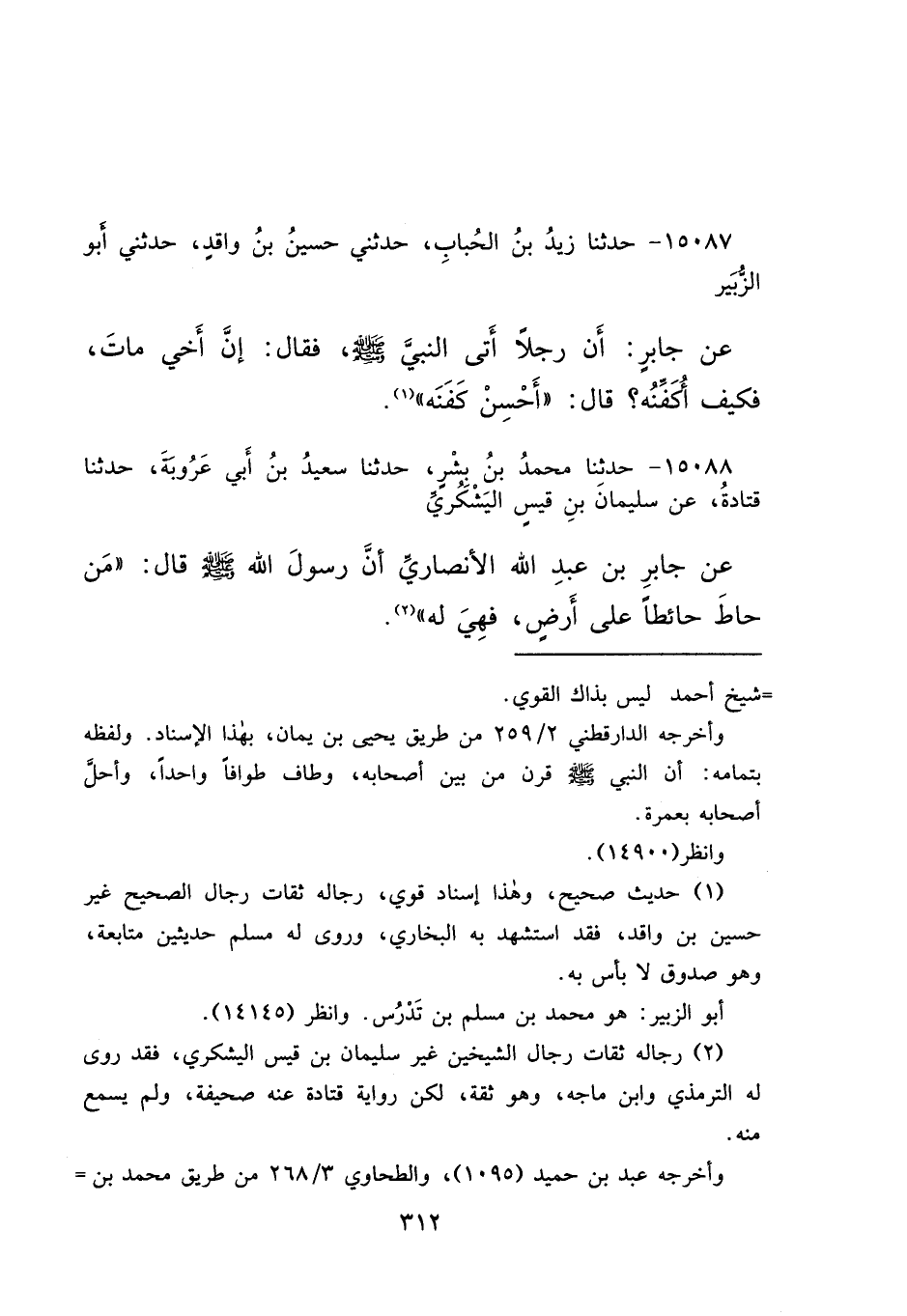 ١٥٠٨٧ - حَدَّثَنَا زَيْدُ بْنُ الْحُبَابِ، حَدَّثَنِي حُسَيْنُ بْنُ وَاقِدٍ، حَدَّثَنِي أَبُو الزُّبَيْرِ، عَنْ جَابِرٍ، أَنَّ رَجُلًا أَتَى النَّبِيَّ صَلَّى اللهُ عَلَيْهِ وَسَلَّمَ فَقَالَ: إِنَّ أَخِي مَاتَ فَكَيْفَ أُكَفِّنُهُ؟ قَالَ: " أَحْسِنْ كَفَنَهُ " (١)