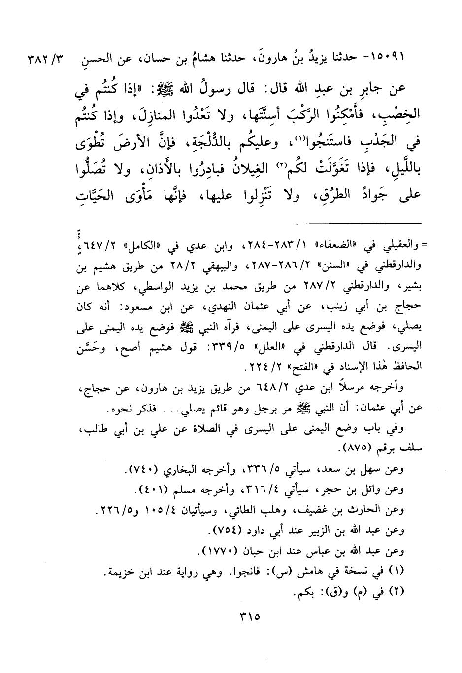 ١٥٠٩١ - حَدَّثَنَا يَزِيدُ بْنُ هَارُونَ، حَدَّثَنَا هِشَامُ بْنُ حَسَّانَ، عَنِ الْحَسَنِ، عَنْ جَابِرِ بْنِ عَبْدِ اللهِ، قَالَ: قَالَ رَسُولُ اللهِ صَلَّى اللهُ عَلَيْهِ وَسَلَّمَ: " إِذَا كُنْتُمْ فِي الْخِصْبِ، فَأَمْكِنُوا الرَّكْبَ أَسِنَّتَهَا، وَلَا تَعْدُوا الْمَنَازِلَ، وَإِذَا كُنْتُمْ فِي الْجَدْبِ، فَاسْتَنْجُوا، (١) وَعَلَيْكُمْ بِالدُّلْجَةِ، فَإِنَّ الْأَرْضَ تُطْوَى بِاللَّيْلِ، فَإِذَا تَغَوَّلَتْ لَكُمُ (٢) الْغِيلَانُ، فَبَادِرُوا بِالْأَذَانِ، وَلَا تُصَلُّوا عَلَى جَوَادِ الطُّرُقِ، وَلَا تَنْزِلُوا عَلَيْهَا، فَإِنَّهَا مَأْوَى الْحَيَّاتِ،