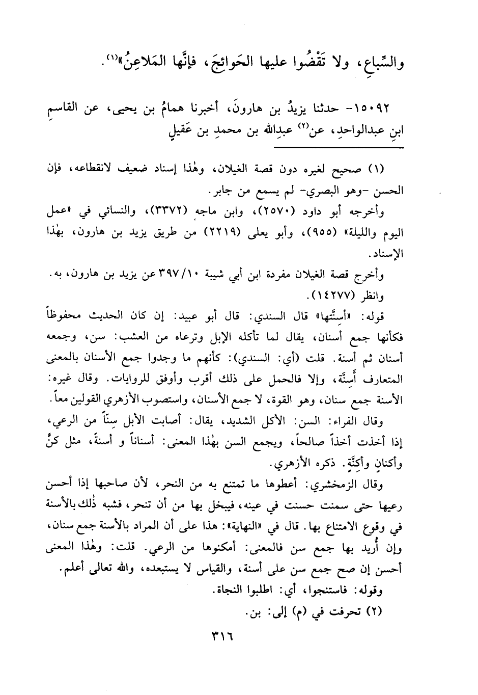 قوله: "أسِنَتها" قال السندي: قال أبو عبيد: إن كان الحديث محفوظاً فكأنها جمع أسنان، يقال لما تأكله الإبل وترعاه من العشب: سن، وجمعه أسنان ثم أسنة. قلت (أي: السندي) : كأنهم ما وجدوا جمع الأسنان بالمعنى المتعارف أَسِنَة، وإلا فالحمل على ذلك أقرب وأوفق للروايات. وقال غيره: الأسنة جمع سنان، وهو القوة، لا جمع الأسنان، واستصوب الأزهري القولين معا.