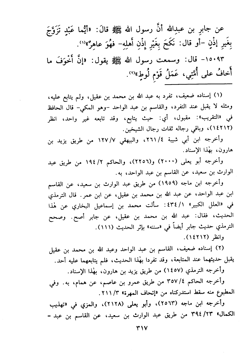 عَنْ جَابِرِ بْنِ عَبْدِ اللهِ، أَنَّ رَسُولَ اللهِ صَلَّى اللهُ عَلَيْهِ وَسَلَّمَ قَالَ: " أَيُّمَا عَبْدٍ تَزَوَّجَ بِغَيْرِ إِذْنٍ - أَوْ قَالَ: نَكَحَ بِغَيْرِ إِذْنِ - أَهْلِهِ فَهُوَ عَاهِرٌ " (١)