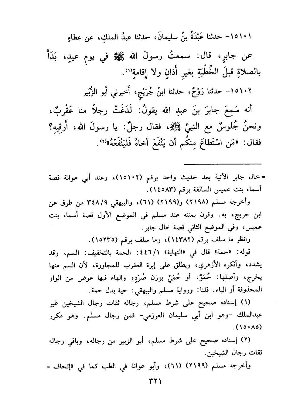 ١٥١٠٢ - حَدَّثَنَا رَوْحٌ، حَدَّثَنَا ابْنُ جُرَيْجٍ، أَخْبَرَنِي أَبُو الزُّبَيْرِ، أَنَّهُ سَمِعَ جَابِرَ بْنَ عَبْدِ اللهِ، يَقُولُ: لَدَغَتْ رَجُلًا مِنَّا عَقْرَبٌ، وَنَحْنُ جُلُوسٌ مَعَ النَّبِيِّ صَلَّى اللهُ عَلَيْهِ وَسَلَّمَ فَقَالَ رَجُلٌ: يَا رَسُولَ اللهِ أَرْقِيهِ؟ فَقَالَ: " مَنْ اسْتَطَاعَ مِنْكُمْ أَنْ يَنْفَعَ أَخَاهُ فَلْيَنْفَعْهُ " (٢)