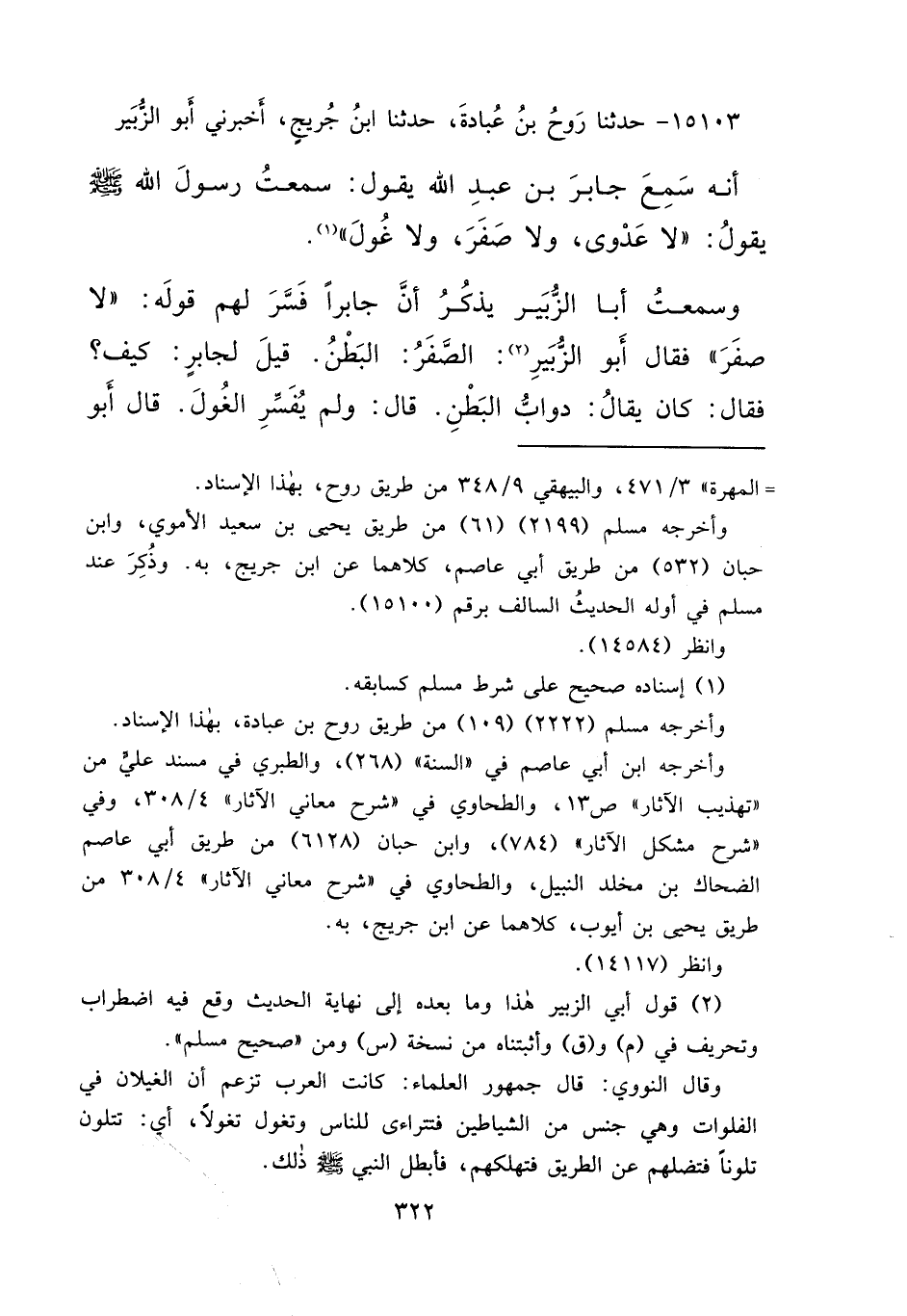 ١٥١٠٣ - حَدَّثَنَا رَوْحُ بْنُ عُبَادَةَ، حَدَّثَنَا ابْنُ جُرَيْجٍ، أَخْبَرَنِي أَبُو الزُّبَيْرِ، أَنَّهُ سَمِعَ جَابِرَ بْنَ عَبْدِ اللهِ يَقُولُ: سَمِعْتُ رَسُولَ اللهِ صَلَّى اللهُ عَلَيْهِ وَسَلَّمَ يَقُولُ: " لَا عَدْوَى، وَلَا صَفَرَ، وَلَا غُولَ " (١) وسَمِعْتُ أَبَا الزُّبَيْرِ يَذْكُرُ: أَنَّ جَابِرًا فَسَّرَ لَهُمْ قَوْلَهُ: " لَا صَفَرَ " فَقَالَ أَبُو الزُّبَيْرِ: (٢) الصَّفَرُ الْبَطْنُ، قِيلَ لِجَابِرٍ: كَيْفَ؟ فَقَالَ: كَانَ يُقَالُ: دَوَابُّ الْبَطْنِ، قَالَ: وَلَمْ يُفَسِّرِ الْغُولَ قَالَ أَبُو