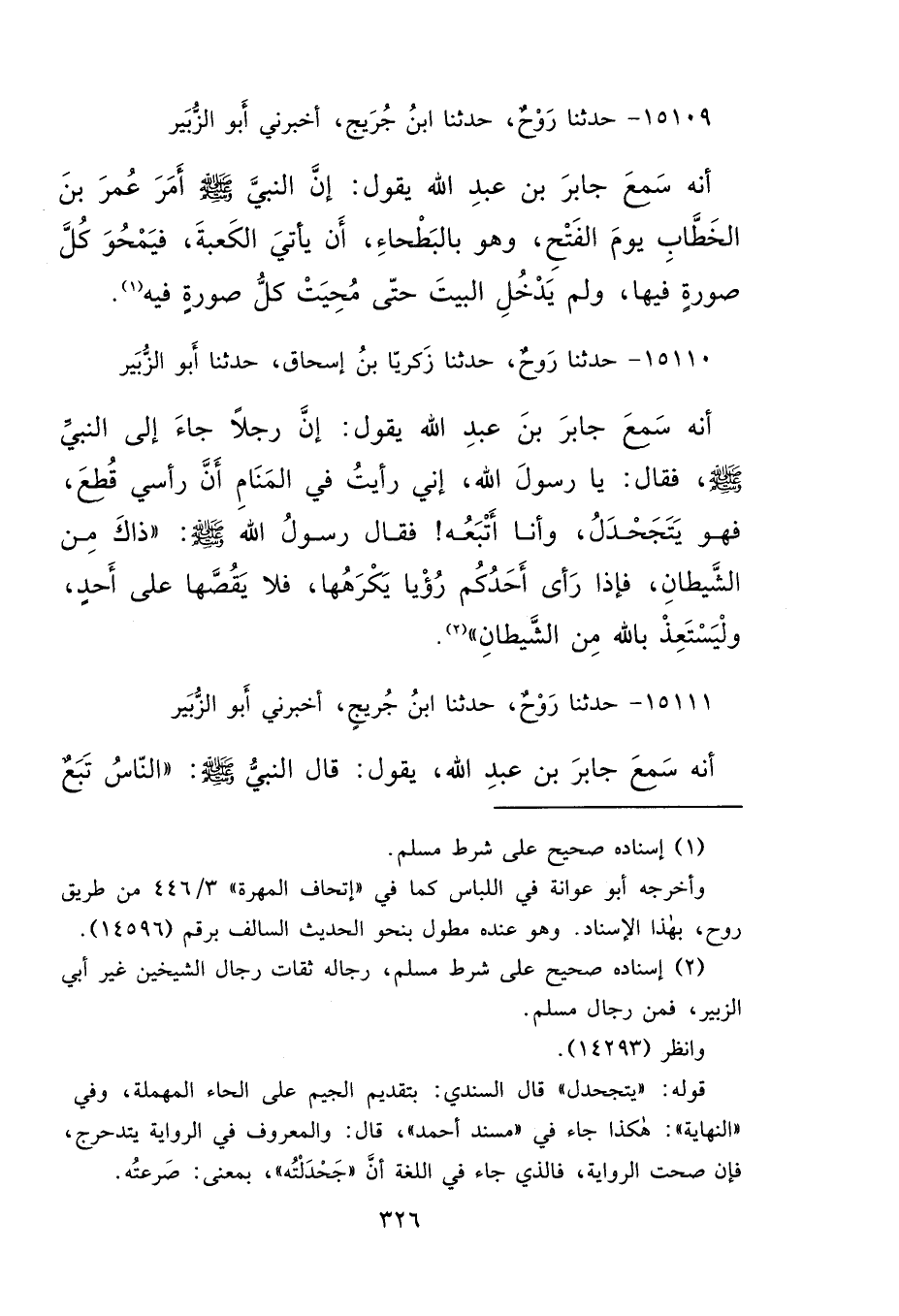 ١٥١١٠ - حَدَّثَنَا رَوْحٌ، حَدَّثَنَا زَكَرِيَّا بْنُ إِسْحَاقَ، حَدَّثَنَا أَبُو الزُّبَيْرِ، أَنَّهُ سَمِعَ جَابِرَ بْنَ عَبْدِ اللهِ، يَقُولُ: إِنَّ رَجُلًا جَاءَ إِلَى النَّبِيِّ صَلَّى اللهُ عَلَيْهِ وَسَلَّمَ فَقَالَ: يَا رَسُولَ اللهِ إِنِّي رَأَيْتُ فِي الْمَنَامِ أَنَّ رَأْسِي قُطِعَ، فَهُوَ يَتَجَحْدَلُ، وَأَنَا أَتْبَعُهُ. فَقَالَ رَسُولُ اللهِ صَلَّى اللهُ عَلَيْهِ وَسَلَّمَ: " ذَاكَ مِنَ الشَّيْطَانِ، فَإِذَا رَأَى أَحَدُكُمْ رُؤْيَا يَكْرَهُهَا، فَلَا يَقُصَّهَا عَلَى أَحَدٍ، وَلْيَسْتَعِذْ بِاللهِ مِنَ الشَّيْطَانِ " (٢)