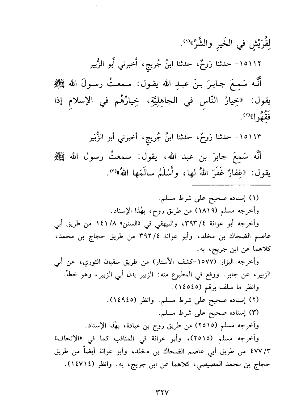 ١٥١١٢ - حَدَّثَنَا رَوْحٌ، حَدَّثَنَا ابْنُ جُرَيْجٍ، أَخْبَرَنِي أَبُو الزُّبَيْرِ، أَنَّهُ سَمِعَ جَابِرَ بْنَ عَبْدِ اللهِ، يَقُولُ: سَمِعْتُ رَسُولَ اللهِ صَلَّى اللهُ عَلَيْهِ وَسَلَّمَ يَقُولُ: " خِيَارُ النَّاسِ فِي الْجَاهِلِيَّةِ، خِيَارُهُمْ فِي الْإِسْلَامِ إِذَا فَقِهُوا " (٢)