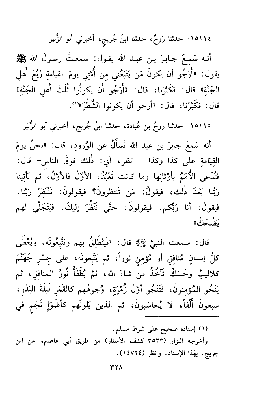 ١٥١١٥ - حَدَّثَنَا رَوْحُ بْنُ عُبَادَةَ، حَدَّثَنَا ابْنُ جُرَيْجٍ، أَخْبَرَنِي أَبُو الزُّبَيْرِ، أَنَّهُ سَمِعَ جَابِرَ بْنَ عَبْدِ اللهِ، يَسْأَلُ عَنِ الْوُرُودِ، قَالَ: نَحْنُ يَوْمَ الْقِيَامَةِ عَلَى كَذَا، وَكَذَا " انْظُرْ، أَيْ: ذَلِكَ فَوْقَ النَّاسِ، قَالَ: " فَتُدْعَى الْأُمَمُ بِأَوْثَانِهَا، وَمَا كَانَتْ تَعْبُدُ الْأَوَّلَ، فَالْأَوَّلَ، ثُمَّ يَأْتِينَا رَبُّنَا بَعْدَ ذَلِكَ فَيَقُولُ: مَنْ تَنْتَظِرُونَ؟ فَيَقُولُونَ: نَنْتَظِرُ رَبَّنَا عَزَّ وَجَلَّ، فَيَقُولُ: أَنَا رَبُّكُمْ، فَيَقُولُونَ: حَتَّى نَنْظُرَ إِلَيْكَ، فَيَتَجَلَّى لَهُمْ يَضْحَكُ " قَالَ: سَمِعْتُ النَّبِيَّ صَلَّى اللهُ عَلَيْهِ وَسَلَّمَ قَالَ: " فَيَنْطَلِقُ بِهِمْ، وَيَتَّبِعُونَهُ، وَيُعْطَى كُلُّ إِنْسَانٍ مُنَافِقٍ، أَوْ مُؤْمِنٍ نُورًا، ثُمَّ يَتَّبِعُونَهُ عَلَى جِسْرِ جَهَنَّمَ كَلَالِيبُ، وَحَسَكٌ تَأْخُذُ مَنْ شَاءَ اللهُ، ثُمَّ يُطْفَأُ نُورُ الْمُنَافِقِ، ثُمَّ يَنْجُو الْمُؤْمِنُونَ فَتَنْجُو أَوَّلُ زُمْرَةٍ وُجُوهُهُمْ كَالْقَمَرِ لَيْلَةَ الْبَدْرِ سَبْعُونَ أَلْفًا لَا يُحَاسَبُونَ، ثُمَّ الَّذِينَ يَلُونَهُمْ كَأَضْوَإِ نَجْمٍ فِي