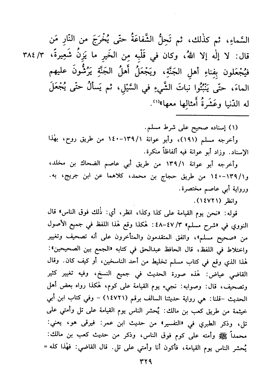 قوله: "نحن يوم القيامة على كذا وكذا، انظر، أي: ذلك فوق الناس" قال النووي في "شرح مسلم" ٣/٤٧-٤٨: هكذا وقع هذا اللفظ في جميع الأصول من "صحيح مسلم"، واتفق المتقدمون والمتأخرون على أنه تصحيف وتغيير واختلاط في اللفظ، قال الحافظ عبد الحق في كتابه "الجمع بين الصحيحين": هذا الذي وقع في كتاب مسلم تخليط من أحد الناسخين، أو كيف كان. وقال القاضي عياض: هذه صورة الحديث في جميع النسخ، وفيه تغيير كثير وتصحيف، قال: وصوابه: نجيء يوم القيامة على كوم، هكذا رواه بعض أهل الحديث- قلنا: هي رواية حديثنا السالف برقم (١٤٧٢١) - وفي كتاب ابن أبي خيثمة من طريق كعب بن مالك: يُحشر الناس يوم القيامة على تل وأمتي على تل، وذكر الطبري في "التفسير" من حديث ابن عمر: فيرقى هو، يعني: محمداً صَلَّى اللهُ عَلَيْهِ وَسَلَّمَ وأمته على كوم فوق الناس، وذكر من حديث كعب بن مالك: يُحشر الناس يوم القيامة، فأكون أنا وأمتي على تل. قال القاضي: فهذا كله=