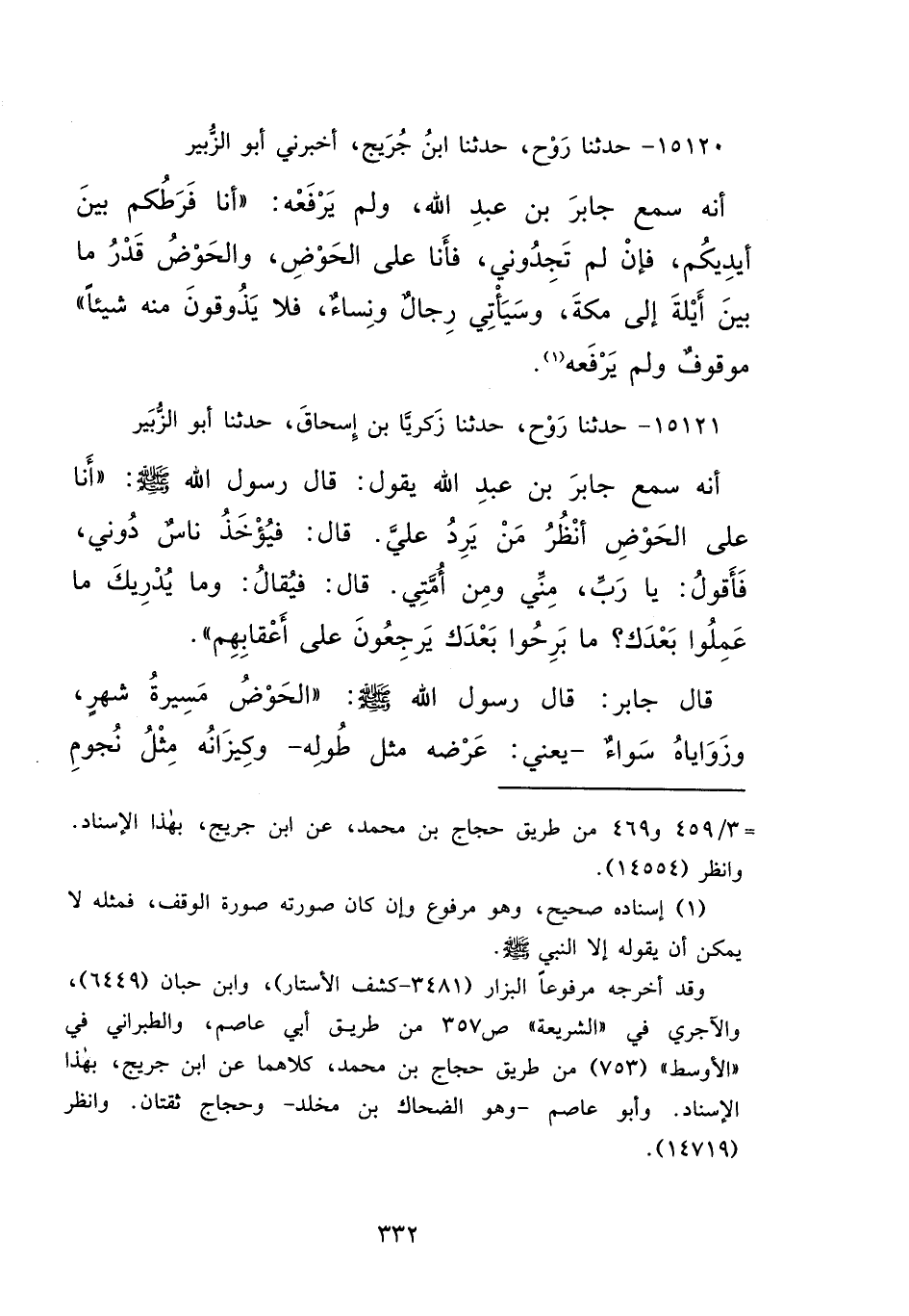 ١٥١٢٠ - حَدَّثَنَا رَوْحٌ، حَدَّثَنَا ابْنُ جُرَيْجٍ، أَخْبَرَنِي أَبُو الزُّبَيْرِ، أَنَّهُ سَمِعَ جَابِرَ بْنَ عَبْدِ اللهِ، وَلَمْ يَرْفَعْهُ " أَنَا فَرَطُكُمْ بَيْنَ أَيْدِيكُمْ، فَإِنْ لَمْ تَجِدُونِي، فَأَنَا عَلَى الْحَوْضِ، وَالْحَوْضُ قَدْرُ مَا بَيْنَ أَيْلَةَ إِلَى مَكَّةَ، وَسَيَأْتِي رِجَالٌ، وَنِسَاءٌ فَلَا يَذُوقُونَ مِنْهُ شَيْئًا " مَوْقُوفٌ وَلَمْ يَرْفَعْهُ (١)