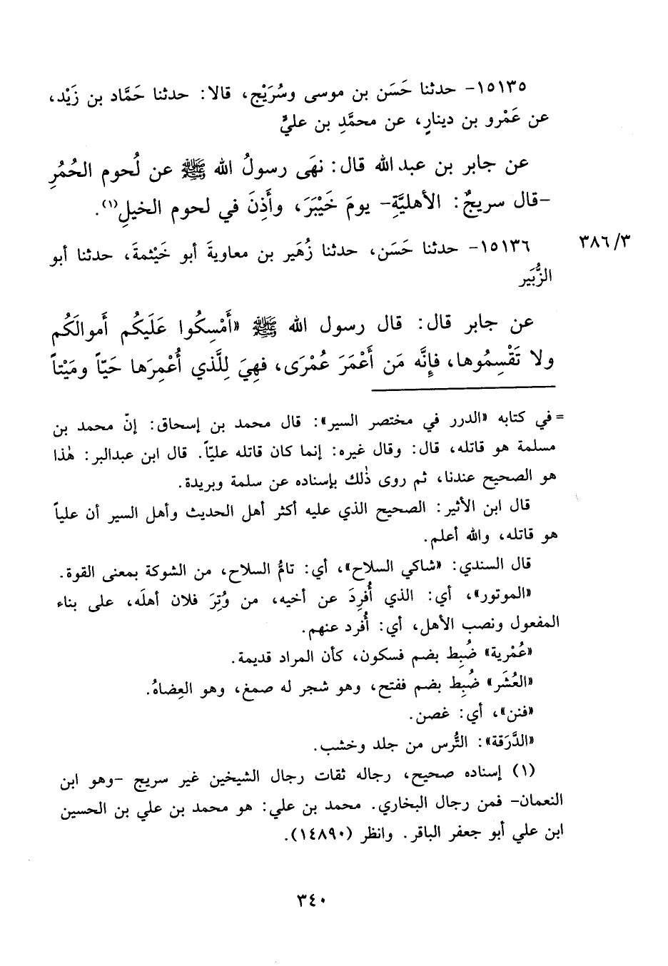 ١٥١٣٦ - حَدَّثَنَا حَسَنٌ، حَدَّثَنَا زُهَيْرُ بْنُ مُعَاوِيَةَ أَبُو خَيْثَمَةَ، حَدَّثَنَا أَبُو الزُّبَيْرِ، عَنْ جَابِرٍ، قَالَ: قَالَ رَسُولُ اللهِ صَلَّى اللهُ عَلَيْهِ وَسَلَّمَ: " أَمْسِكُوا عَلَيْكُمْ أَمْوَالَكُمْ، وَلَا تَقْسِمُوهَا، فَإِنَّهُ مَنْ أَعْمَرَ عُمْرَى فَهِيَ لِلَّذِي أَعْمَرَهَا حَيًّا، وَمَيِّتًا،