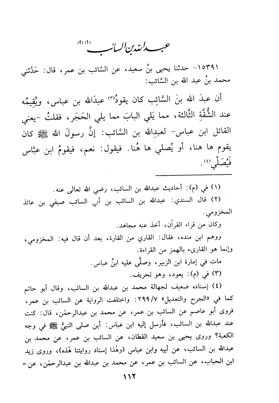 ١٥٣٩١ - حَدَّثَنَا يَحْيَى بْنُ سَعِيدٍ، عَنِ السَّائِبِ بْنِ عُمَرَ، قَالَ: حَدَّثَنِي مُحَمَّدُ بْنُ عَبْدِ اللهِ بْنِ السَّائِبِ، أَنَّ عَبْدَ اللهِ بْنَ السَّائِبِ، كَانَ يَقُودُ (٣) عَبْدَ اللهِ بْنَ عَبَّاسٍ وَيُقِيمُهُ عِنْدَ الشِّقَّةِ الثَّالِثَةِ مِمَّا يَلِي الْبَابَ، مِمَّا يَلِي الْحَجَرَ، فَقُلْتُ: يَعْنِي الْقَائِلُ ابْنُ عَبَّاسٍ لِعَبْدِ اللهِ بْنِ السَّائِبِ: " إِنَّ رَسُولَ اللهِ صَلَّى اللهُ عَلَيْهِ وَسَلَّمَ كَانَ يَقُومُ هَاهُنَا أَوْ يُصَلِّي هَاهُنَا "؟ فَيَقُولُ: نَعَمْ، فَيَقُومُ ابْنُ عَبَّاسٍ فَيُصَلِّي (٤)