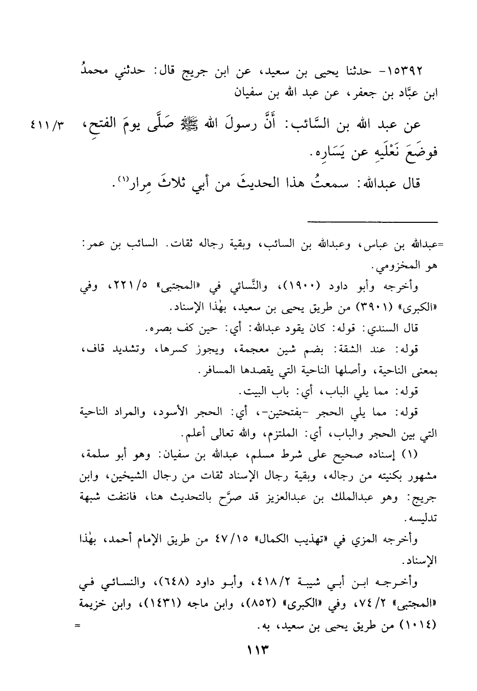 ١٥٣٩٢ - حَدَّثَنَا يَحْيَى بْنُ سَعِيدٍ، عَنِ ابْنِ جُرَيْجٍ، قَالَ: حَدَّثَنِي مُحَمَّدُ بْنُ عَبَّادِ بْنِ جَعْفَرٍ، عَنْ عَبْدِ اللهِ بْنِ سُفْيَانَ، عَنْ عَبْدِ اللهِ بْنِ السَّائِبِ: " أَنَّ رَسُولَ اللهِ صَلَّى اللهُ عَلَيْهِ وَسَلَّمَ صَلَّى يَوْمَ الْفَتْحِ، فَوَضَعَ نَعْلَيْهِ عَنْ يَسَارِهِ " قَالَ عَبْدُ اللهِ: سَمِعْتُ هَذَا الْحَدِيثَ مِنْ أَبِي ثَلَاثَ مِرَارٍ (١)