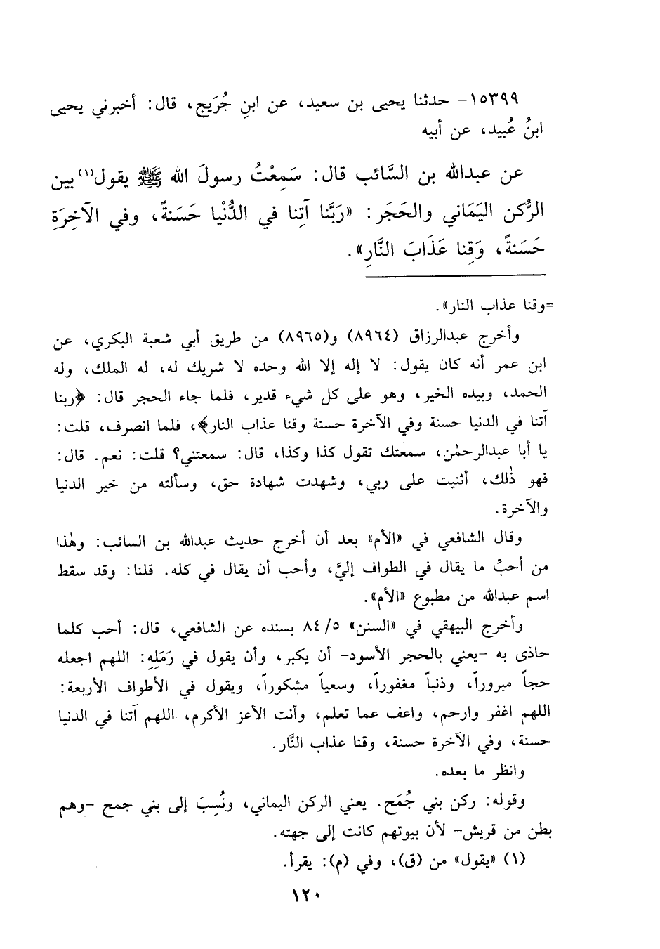 ١٥٣٩٩ - حَدَّثَنَا يَحْيَى بْنُ سَعِيدٍ، عَنِ ابْنِ جُرَيْجٍ، قَالَ: أَخْبَرَنِي يَحْيَى بْنُ عُبَيْدٍ، عَنْ أَبِيهِ، عَنْ عَبْدِ اللهِ بْنِ السَّائِبِ، قَالَ: سَمِعْتُ رَسُولَ اللهِ صَلَّى اللهُ عَلَيْهِ وَسَلَّمَ: " يَقُولُ (١) بَيْنَ الرُّكْنِ الْيَمَانِي وَالْحَجَرِ: {رَبَّنَا آتِنَا فِي الدُّنْيَا حَسَنَةً، وَفِي الْآخِرَةِ حَسَنَةً، وَقِنَا} [البقرة: ٢٠١] عَذَابَ النَّارِ "،