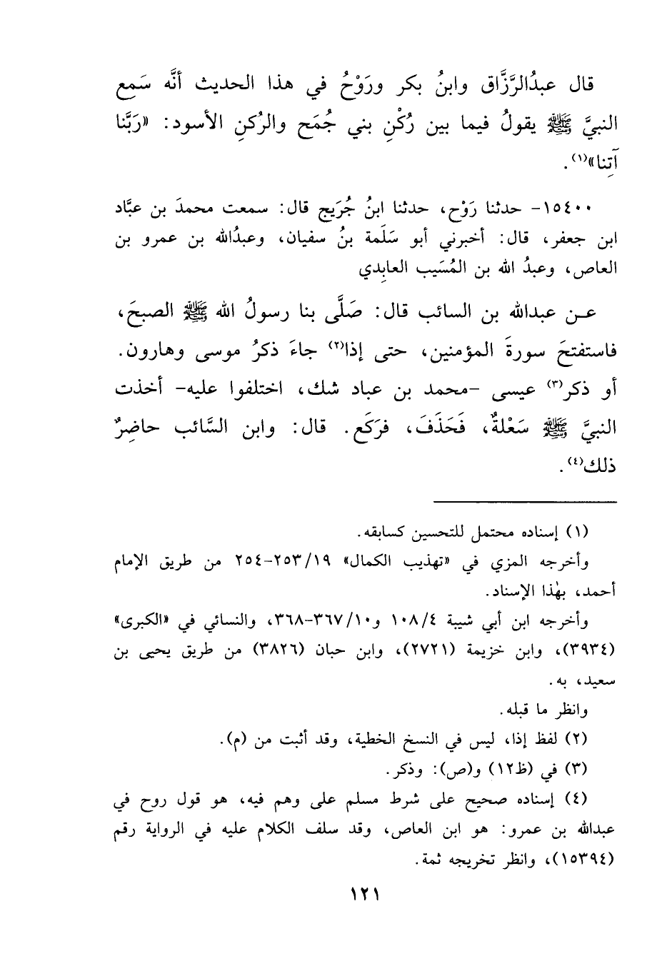 ١٥٤٠٠ - حَدَّثَنَا رَوْحٌ، حَدَّثَنَا ابْنُ جُرَيْجٍ، قَالَ: سَمِعْتُ مُحَمَّدَ بْنَ عَبَّادِ بْنِ جَعْفَرٍ، قَالَ: أَخْبَرَنِي أَبُو سَلَمَةَ بْنُ سُفْيَانَ، وَعَبْدُ اللهِ بْنُ عَمْرِو بْنِ الْعَاصِ، وَعَبْدُ اللهِ بْنُ الْمُسَيَّبِ الْعَابِدِيُّ، عَنْ عَبْدِ اللهِ بْنِ السَّائِبِ، قَالَ: " صَلَّى بِنَا رَسُولُ اللهِ صَلَّى اللهُ عَلَيْهِ وَسَلَّمَ الصُّبْحَ، فَاسْتَفْتَحَ سُورَةَ الْمُؤْمِنِينَ، حَتَّى إِذَا (٢) جَاءَ ذِكْرُ مُوسَى وَهَارُونَ - أَوْ ذِكْرُ (٣) عِيسَى، مُحَمَّدُ بْنُ عَبَّادٍ شَكَّ، اخْتَلَفُوا عَلَيْهِ - أَخَذَتِ النَّبِيَّ صَلَّى اللهُ عَلَيْهِ وَسَلَّمَ سَعْلَةٌ فَحَذَفَ، فَرَكَعَ " قَالَ: وَابْنُ السَّائِبِ حَاضِرُ ذَلِكَ (٤)