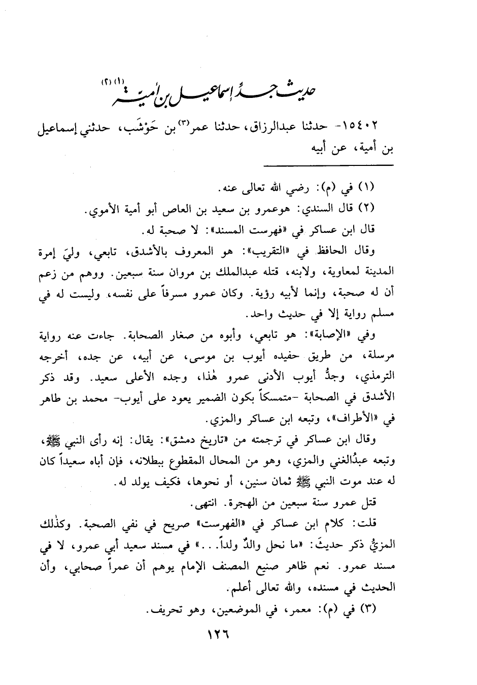 قلت: كلام ابن عساكر في "الفهرست" صريح في نفي الصحبة. وكذلك المزيُّ ذكر حديثَ: "ما نحل والد ولداً ... " في مسند سعيد أبي عمرو، لا في مسند عمرو. نعم ظاهر صنيع المصنف الإمام يوهم أن عمراً صحابي، وأن الحديث في مسنده، والله تعالى أعلم.