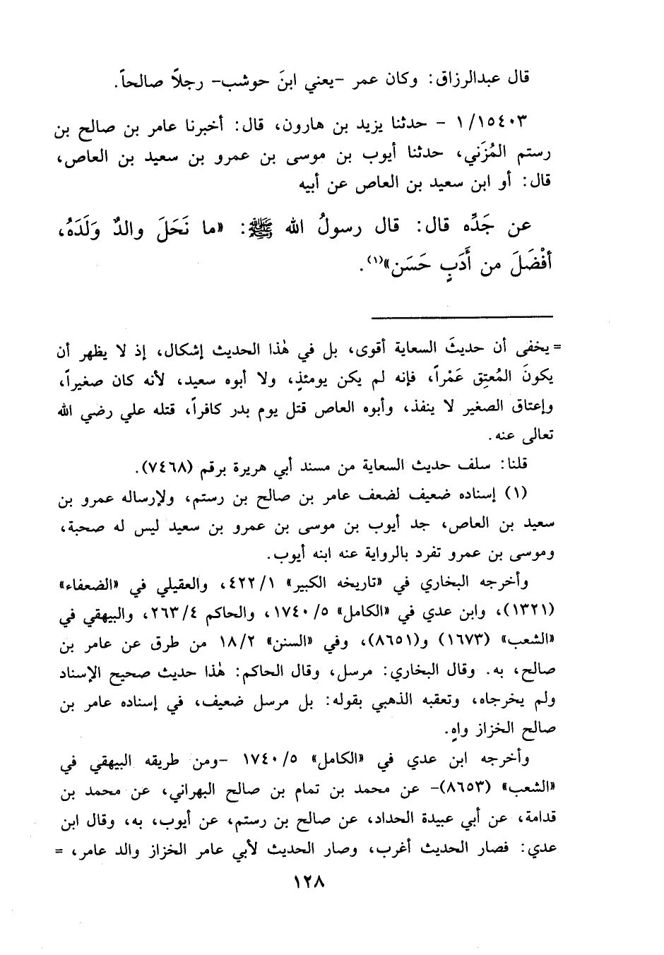١٥٤٠٣/١ - حَدَّثَنَا يَزِيدُ بْنُ هَارُونَ، قَالَ: أَخْبَرَنَا عَامِرُ بْنُ صَالِحِ بْنِ رُسْتُمَ الْمُزَنِيُّ، حَدَّثَنَا أَيُّوبُ بْنُ مُوسَى بْنِ عَمْرِو بْنِ سَعِيدِ بْنِ الْعَاصِ قَالَ: أَوْ ابْنُ سَعِيدِ بْنِ الْعَاصِ، عَنْ أَبِيهِ، عَنْ جَدِّهِ، قَالَ: قَالَ رَسُولُ اللهِ صَلَّى اللهُ عَلَيْهِ وَسَلَّمَ: " مَا نَحَلَ وَالِدٌ وَلَدَهُ أَفْضَلَ مِنْ أَدَبٍ حَسَنٍ " (١)