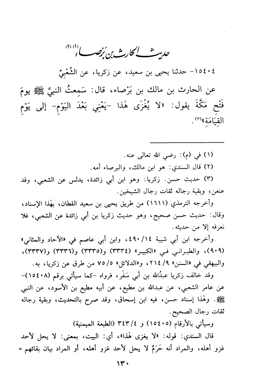 ١٥٤٠٤ - حَدَّثَنَا يَحْيَى بْنُ سَعِيدٍ، عَنْ زَكَرِيَّا، عَنِ الشَّعْبِيِّ، عَنِ الْحَارِثِ بْنِ مَالِكِ ابْنِ بَرْصَاءَ، قَالَ: سَمِعْتُ النَّبِيَّ صَلَّى اللهُ عَلَيْهِ وَسَلَّمَ يَوْمَ فَتْحِ مَكَّةَ، يَقُولُ: " لَا يُغْزَى هَذَا - يَعْنِي - بَعْدَ الْيَوْمِ إِلَى يَوْمِ الْقِيَامَةِ " (٣)
