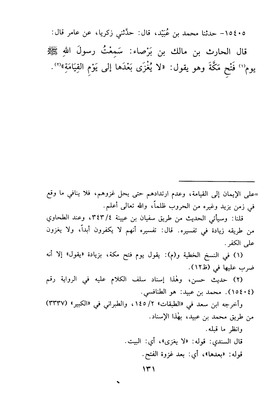 ١٥٤٠٥ - حَدَّثَنَا مُحَمَّدُ بْنُ عُبَيْدٍ، قَالَ: حَدَّثَنِي زَكَرِيَّا، عَنْ عَامِرٍ، قَالَ: قَالَ الْحَارِثُ بْنُ مَالِكِ ابْنِ بَرْصَاءَ: سَمِعْتُ رَسُولَ اللهِ صَلَّى اللهُ عَلَيْهِ وَسَلَّمَ يَوْمَ (١) فَتْحِ مَكَّةَ وَهُوَ يَقُولُ: " لَا يُغْزَى بَعْدَهَا إِلَى يَوْمِ الْقِيَامَةِ " (٢)