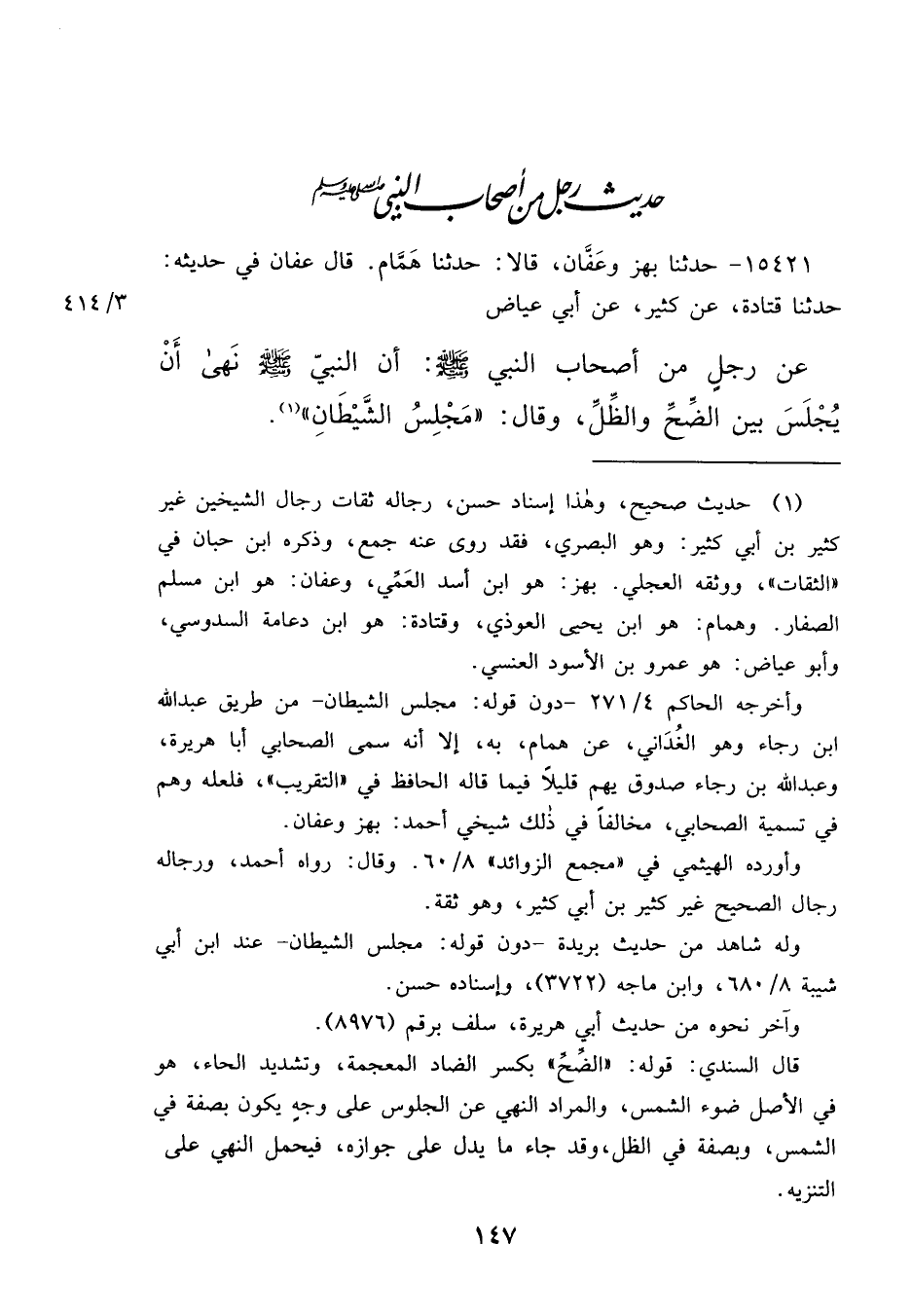 ١٥٤٢١ - حَدَّثَنَا بَهْزٌ، وَعَفَّانُ، قَالَا: حَدَّثَنَا هَمَّامٌ، قَالَ عَفَّانُ فِي حَدِيثِهِ: حَدَّثَنَا قَتَادَةُ، عَنْ كَثِيرٍ، عَنْ أَبِي عِيَاضٍ، عَنْ رَجُلٍ، مِنْ أَصْحَابِ النَّبِيِّ صَلَّى اللهُ عَلَيْهِ وَسَلَّمَ: أَنَّ النَّبِيَّ صَلَّى اللهُ عَلَيْهِ وَسَلَّمَ نَهَى أَنْ يُجْلَسَ بَيْنَ الضِّحِّ وَالظِّلِّ، وَقَالَ: " مَجْلِسُ الشَّيْطَانِ " (١)