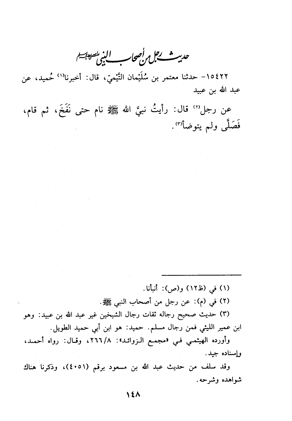 ١٥٤٢٢ - حَدَّثَنَا مُعْتَمِرُ بْنُ سُلَيْمَانَ التَّيْمِيُّ، قَالَ: أَخْبَرَنَا (١) حُمَيْدٌ، عَنْ عَبْدِ اللهِ بْنِ عُبَيْدٍ، عَنْ رَجُلٍ، (٢) قَالَ: " رَأَيْتُ نَبِيَّ اللهِ صَلَّى اللهُ عَلَيْهِ وَسَلَّمَ نَامَ حَتَّى نَفَخَ، ثُمَّ قَامَ فَصَلَّى، وَلَمْ يَتَوَضَّأْ " (٣)