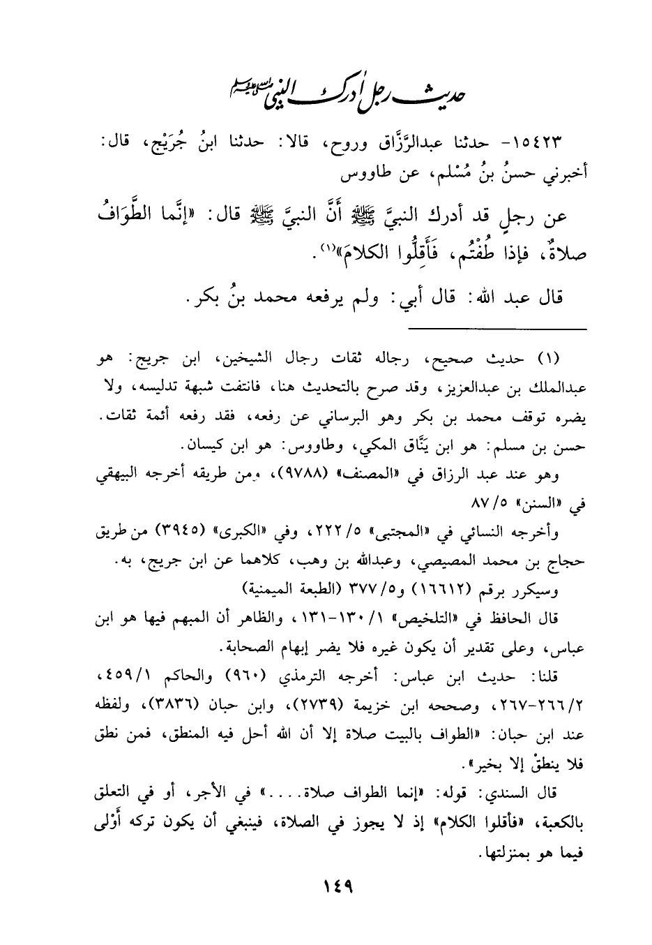 ١٥٤٢٣ - حَدَّثَنَا عَبْدُ الرَزَّاقِ، وَرَوْحٍ، قَالَا: حَدَّثَنَا ابْنُ جُرَيْجٍ، قَالَ: أَخْبَرَنِي حَسَنُ بْنُ مُسْلِمٍ، عَنْ طَاوُسٍ، عَنْ رَجُلٍ قَدْ أَدْرَكَ النَّبِيَّ صَلَّى اللهُ عَلَيْهِ وَسَلَّمَ، أَنَّ النَّبِيَّ صَلَّى اللهُ عَلَيْهِ وَسَلَّمَ قَالَ: " إِنَّمَا الطَّوَافُ صَلَاةٌ، فَإِذَا طُفْتُمْ، فَأَقِلُّوا الْكَلَامَ " (١) قَالَ عَبْدُ اللهِ قَالَ أَبِي: وَلَمْ يَرْفَعْهُ مُحَمَّدُ بْنُ بَكْرٍ