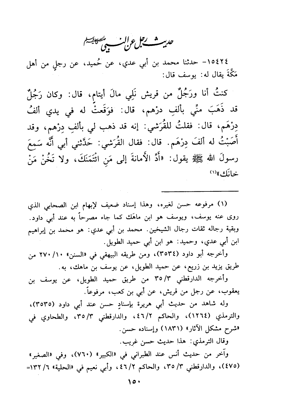 ١٥٤٢٤ - حَدَّثَنَا مُحَمَّدُ بْنُ أَبِي عَدِيٍّ، عَنْ حُمَيْدٍ، عَنْ رَجُلٍ مِنْ أَهْلِ مَكَّةَ، يُقَالُ لَهُ: يُوسُفُ، قَالَ: كُنْتُ أَنَا وَرَجُلٌ مِنْ قُرَيْشٍ نَلِي مَالَ أَيْتَامٍ، قَالَ: وَكَانَ رَجُلٌ قَدْ ذَهَبَ مِنِّي بِأَلْفِ دِرْهَمٍ، قَالَ: فَوَقَعَتْ لَهُ فِي يَدِي أَلْفُ دِرْهَمٍ، قَالَ: فَقُلْتُ لِلْقُرَشِيِّ إِنَّهُ قَدْ ذَهَبَ لِي بِأَلْفِ دِرْهَمٍ، وَقَدْ أَصَبْتُ لَهُ أَلْفَ دِرْهَمٍ، قَالَ: فَقَالَ الْقُرَشِيُّ: حَدَّثَنِي أَبِي، أَنَّهُ سَمِعَ رَسُولَ اللهِ صَلَّى اللهُ عَلَيْهِ وَسَلَّمَ يَقُولُ: " أَدِّ الْأَمَانَةَ إِلَى مَنْ ائْتَمَنَكَ، وَلَا تَخُنْ مَنْ خَانَكَ " (١)