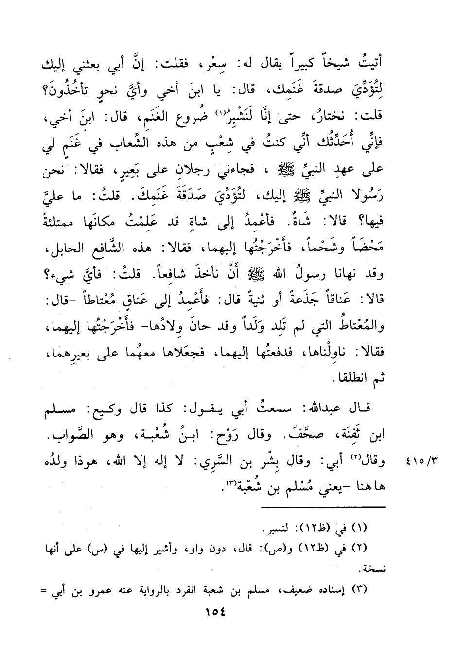 أَتَيْتُ شَيْخًا كَبِيرًا يُقَالُ لَهُ سِعْرٌ، فَقُلْتُ: إِنَّ أَبِي بَعَثَنِي إِلَيْكَ لِتُؤَدِّيَ صَدَقَةَ غَنَمِكَ، قَالَ: يَا ابْنَ أَخِي، وَأَيُّ نَحْوٍ تَأْخُذُونَ؟ قُلْتُ: نَخْتَارُ حَتَّى إِنَّا لَنَشْبُرُ (١) ضُرُوعَ الْغَنَمِ، قَالَ ابْنَ أَخِي: فَإِنِّي أُحَدِّثُكَ أَنِّي كُنْتُ فِي شِعْبٍ مِنْ هَذِهِ الشِّعَابِ فِي غَنَمٍ لِي عَلَى عَهْدِ النَّبِيِّ صَلَّى اللهُ عَلَيْهِ وَسَلَّمَ، فَجَاءَنِي رَجُلَانِ عَلَى بَعِيرٍ، فَقَالَا: نَحْنُ رَسُولَا النَّبِيِّ صَلَّى اللهُ عَلَيْهِ وَسَلَّمَ إِلَيْكَ لِتُؤَدِّيَ صَدَقَةَ غَنَمِكَ، قُلْتُ: مَا عَلَيَّ فِيهَا؟ قَالَا: " شَاةٌ "، فَأَعْمِدُ إِلَى شَاةٍ، قَدْ عَلِمْتُ مَكَانَهَا مُمْتَلِئَةٍ مَحْضًا، وَشَحْمًا، فَأَخْرَجْتُهَا إِلَيْهِمَا، فَقَالَا: " هَذِهِ الشَّافِعُ الْحَائِلُ وَقَدْ نَهَانَا رَسُولُ اللهِ صَلَّى اللهُ عَلَيْهِ وَسَلَّمَ أَنْ نَأْخُذَ شَافِعًا "، قُلْتُ: فَأَيُّ شَيْءٍ؟ قَالَا: " عَنَاقًا جَذَعَةً، أَوْ ثَنِيَّةً " قَالَ: فَأَعْمِدُ إِلَى عَنَاقٍ مُعْتَاطًا - قَالَ: وَالْمُعْتَاطُ الَّتِي لَمْ تَلِدْ وَلَدًا، وَقَدْ حَانَ وِلَادُهَا فَأَخْرَجْتُهَا إِلَيْهِمَا - فَقَالَا: نَاوِلْنَاهَا، فَدَفَعْتُهَا إِلَيْهِمَا فَجَعَلَاهَا مَعَهُمَا عَلَى بَعِيرِهِمَا، ثُمَّ انْطَلَقَا قَالَ عَبْدُ اللهِ: سَمِعْتُ أَبِي يَقُولُ: كَذَا قَالَ وَكِيعٌ: مُسْلِمُ بْنُ ثَفِنَةَ صُحِّفَ، وقَالَ رَوْحٌ: ابْنُ شُعْبَةَ وَهُوَ الصَّوَابُ، وقَالَ (٢) أَبِي: وقَالَ بِشْرُ بْنُ السَّرِيِّ: لَا إِلَهَ إِلَّا اللهُ هُوَ ذَا وَلَدُهُ هَاهُنَا - يَعْنِي مُسْلِمَ بْنَ شُعْبَةَ (٣)