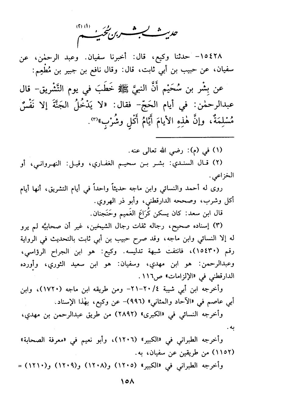 ١٥٤٢٨ - حَدَّثَنَا وَكِيعٌ، قَالَ: أَخْبَرَنَا سُفْيَانُ، وَعَبْدُ الرَّحْمَنِ، عَنْ سُفْيَانَ، عَنْ حَبِيبِ بْنِ أَبِي ثَابِتٍ، قَالَ: وَقَالَ نَافِعُ بْنُ جُبَيْرِ بْنِ مُطْعِمٍ، عَنْ بِشْرِ بْنِ سُحَيْمٍ، أَنَّ النَّبِيَّ صَلَّى اللهُ عَلَيْهِ وَسَلَّمَ خَطَبَ فِي يَوْمِ التَّشْرِيقِ، - قَالَ عَبْدُ الرَّحْمَنِ: فِي أَيَّامِ الْحَجِّ - فَقَالَ: " لَا يَدْخُلُ الْجَنَّةَ إِلَّا نَفْسٌ مُسْلِمَةٌ، وَإِنَّ هَذِهِ الْأَيَّامَ أَيَّامُ أَكْلٍ وَشُرْبٍ " (٣)