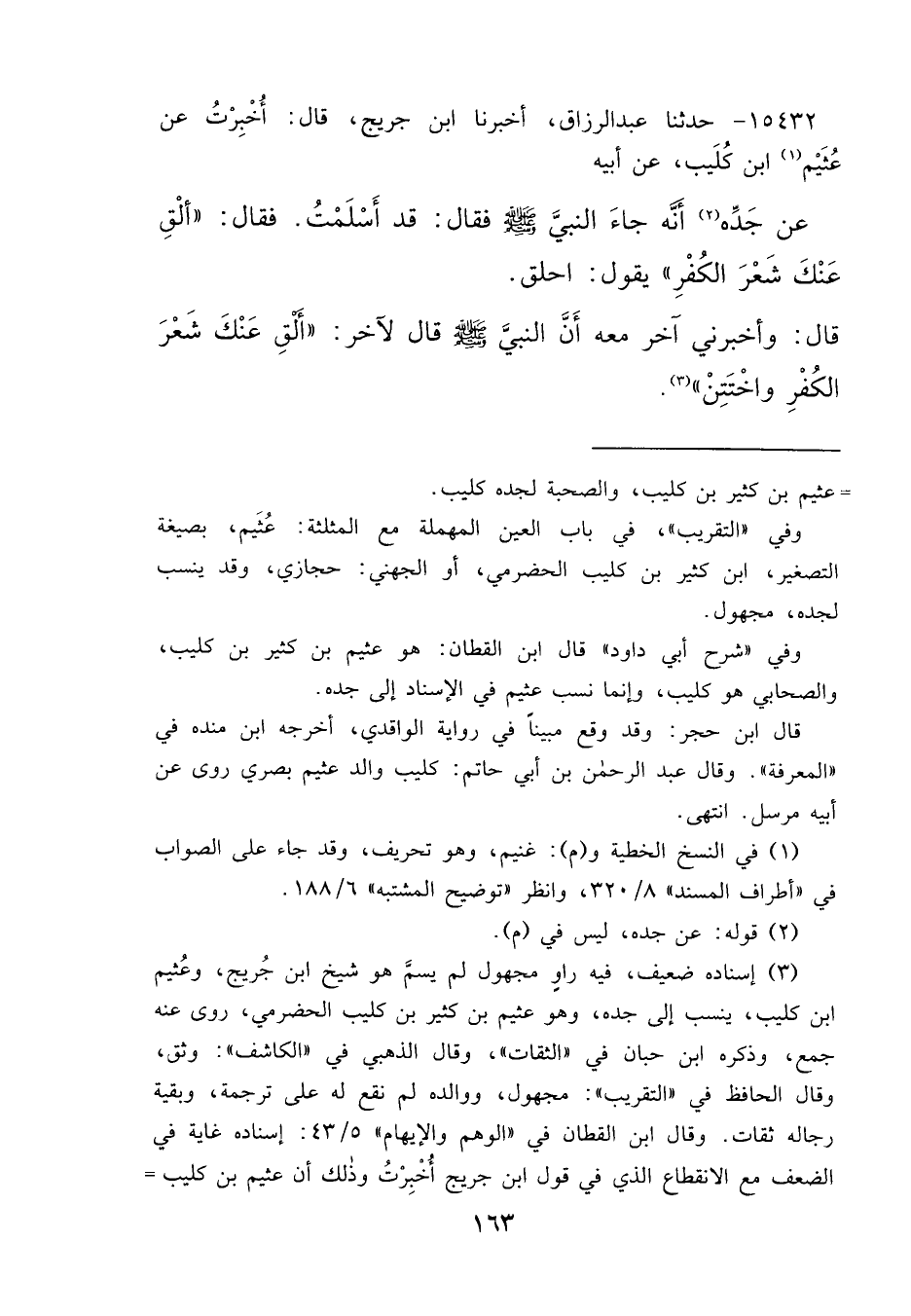 ١٥٤٣٢ - حَدَّثَنَا عَبْدُ الرَّزَّاقِ، أَخْبَرَنَا ابْنُ جُرَيْجٍ، قَالَ: أُخْبِرْتُ، عَنْ عُثَيْمِ (١) بْنِ كُلَيْبٍ، عَنْ أَبِيهِ، عَنْ جَدِّهِ، (٢) أَنَّهُ جَاءَ النَّبِيَّ صَلَّى اللهُ عَلَيْهِ وَسَلَّمَ فَقَالَ: قَدْ أَسْلَمْتُ، فَقَالَ: " أَلْقِ عَنْكَ شَعَرَ الْكُفْرِ " يَقُولُ: احْلِقْ، قَالَ: وَأَخْبَرَنِي آخَرُ مَعَهُ: أَنَّ النَّبِيَّ صَلَّى اللهُ عَلَيْهِ وَسَلَّمَ قَالَ لِآخَرَ: " أَلْقِ عَنْكَ شَعَرَ الْكُفْرِ، وَاخْتَتِنْ " (٣)