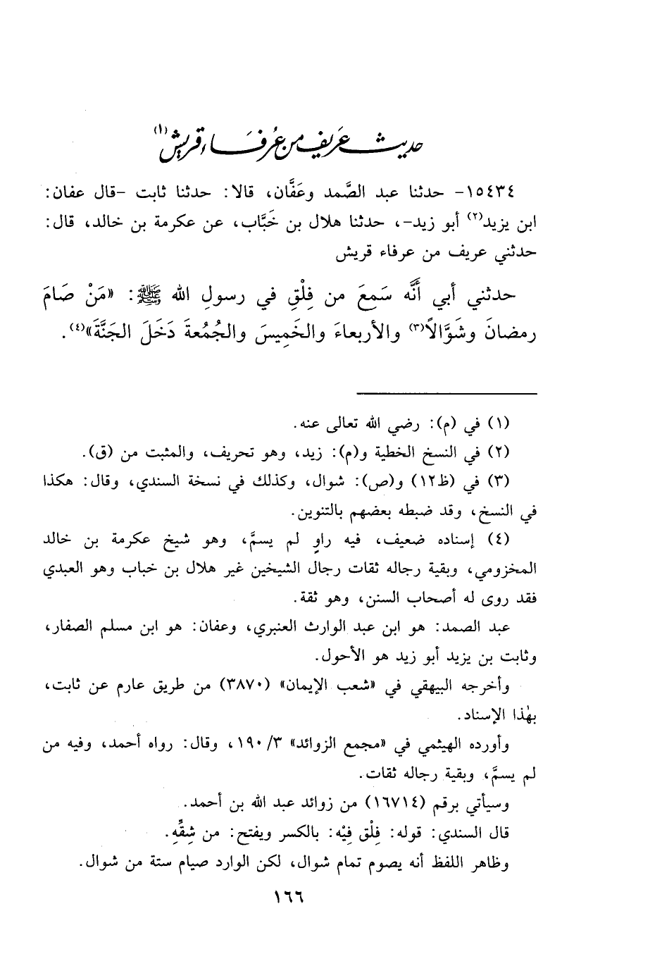 ١٥٤٣٤ - حَدَّثَنَا عَبْدُ الصَّمَدِ، وَعَفَّانُ، قَالَا: حَدَّثَنَا ثَابِتٌ، قَالَ عَفَّانُ: ابْنُ زَيْدٍ (٢) أَبُو زَيْدٍ، حَدَّثَنَا هِلَالُ بْنُ خَبَّابٍ، عَنْ عِكْرِمَةَ بْنِ خَالِدٍ، قَالَ: حَدَّثَنِي عَرِيفٌ، مِنْ عُرَفَاءِ قُرَيْشٍ، حَدَّثَنِي أَبِي، أَنَّهُ سَمِعَ مِنْ فَلْقِ فِي رَسُولِ اللهِ صَلَّى اللهُ عَلَيْهِ وَسَلَّمَ: " مَنْ صَامَ رَمَضَانَ، وَشَوَّالًا، (٣) وَالْأَرْبِعَاءَ، وَالْخَمِيسَ، وَالْجُمُعَةَ دَخَلَ الْجَنَّةَ " (٤)