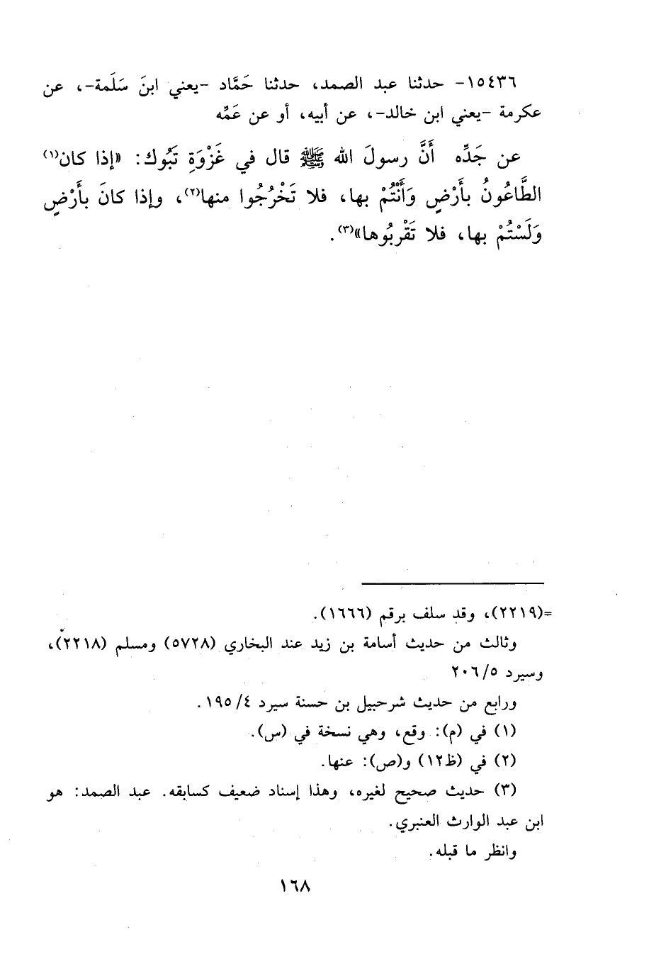 ١٥٤٣٦ - حَدَّثَنَا عَبْدُ الصَّمَدِ، حَدَّثَنَا حَمَّادٌ يَعْنِي ابْنَ سَلَمَةَ، عَنْ عِكْرِمَةَ يَعْنِي ابْنَ خَالِدٍ، عَنْ أَبِيهِ، أَوْ عَنْ عَمِّهِ، عَنْ جَدِّهِ، أَنَّ رَسُولَ اللهِ صَلَّى اللهُ عَلَيْهِ وَسَلَّمَ قَالَ فِي غَزْوَةِ تَبُوكَ: " إِذَا كَانَ (١) الطَّاعُونُ بِأَرْضٍ، وَأَنْتُمْ بِهَا فَلَا تَخْرُجُوا مِنْهَا، (٢) وَإِذَا كَانَ بِأَرْضٍ وَلَسْتُمْ بِهَا فَلَا تَقْرَبُوهَا " (٣)