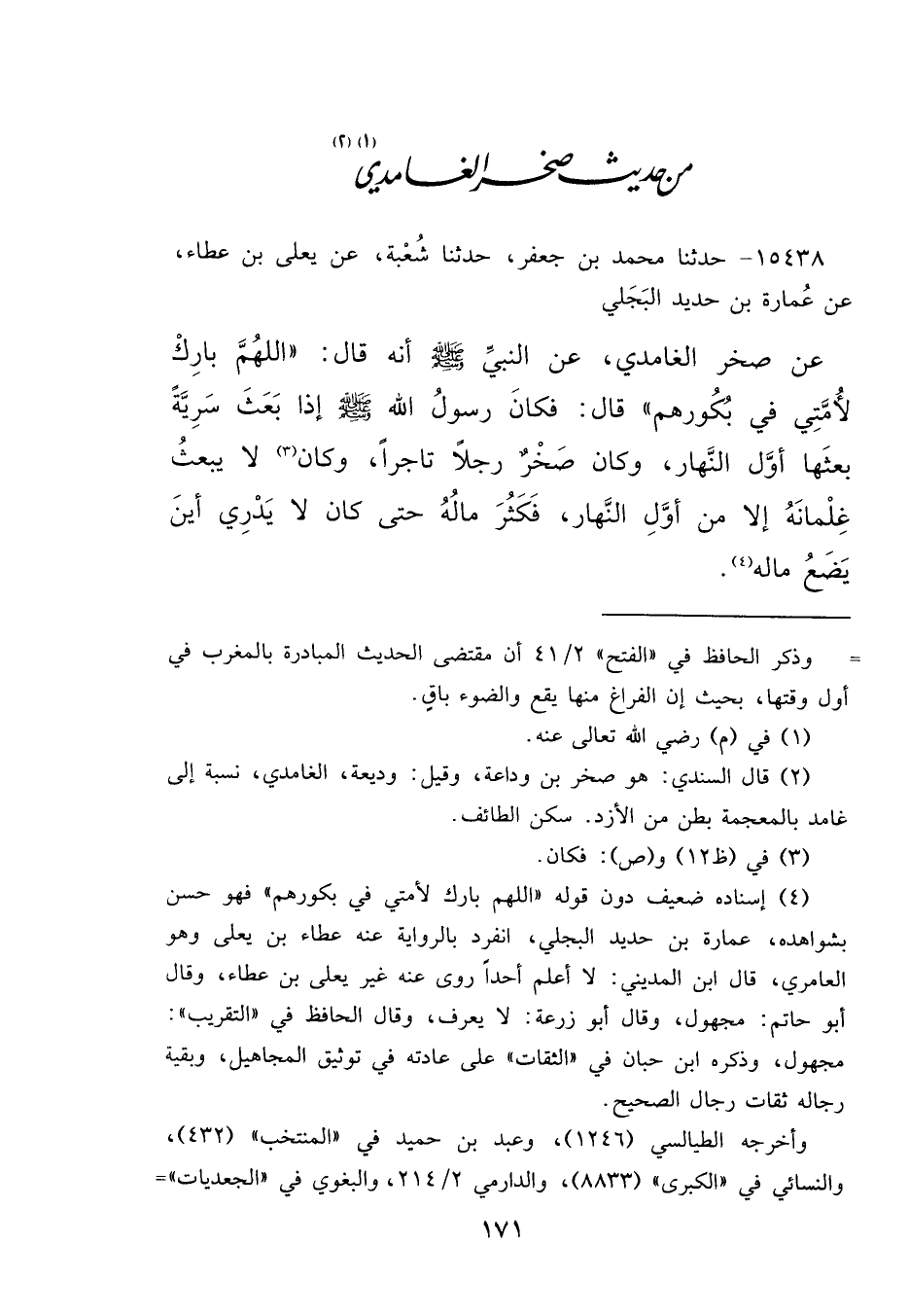 ١٥٤٣٨ - حَدَّثَنَا مُحَمَّدُ بْنُ جَعْفَرٍ، حَدَّثَنَا شُعْبَةُ، عَنْ يَعْلَى بْنِ عَطَاءٍ، عَنْ عُمَارَةَ بْنِ حَدِيدٍ البَجْلِيِّ، عَنْ صَخْرٍ الْغَامِدِيِّ، عَنِ النَّبِيِّ صَلَّى اللهُ عَلَيْهِ وَسَلَّمَ أَنَّهُ قَالَ: " اللهُمَّ بَارِكْ لِأُمَّتِي فِي بُكُورِهِمْ " قَالَ: فَكَانَ رَسُولُ اللهِ صَلَّى اللهُ عَلَيْهِ وَسَلَّمَ إِذَا بَعَثَ سَرِيَّةً بَعَثَهَا أَوَّلَ النَّهَارِ، وَكَانَ صَخْرٌ رَجُلًا تَاجِرًا، وَكَانَ (٣) لَا يَبْعَثُ غِلْمَانَهُ إِلَّا مِنْ أَوَّلِ النَّهَارِ، فَكَثُرَ مَالُهُ حَتَّى كَانَ لَا يَدْرِي أَيْنَ يَضَعُ مَالَهُ (٤)