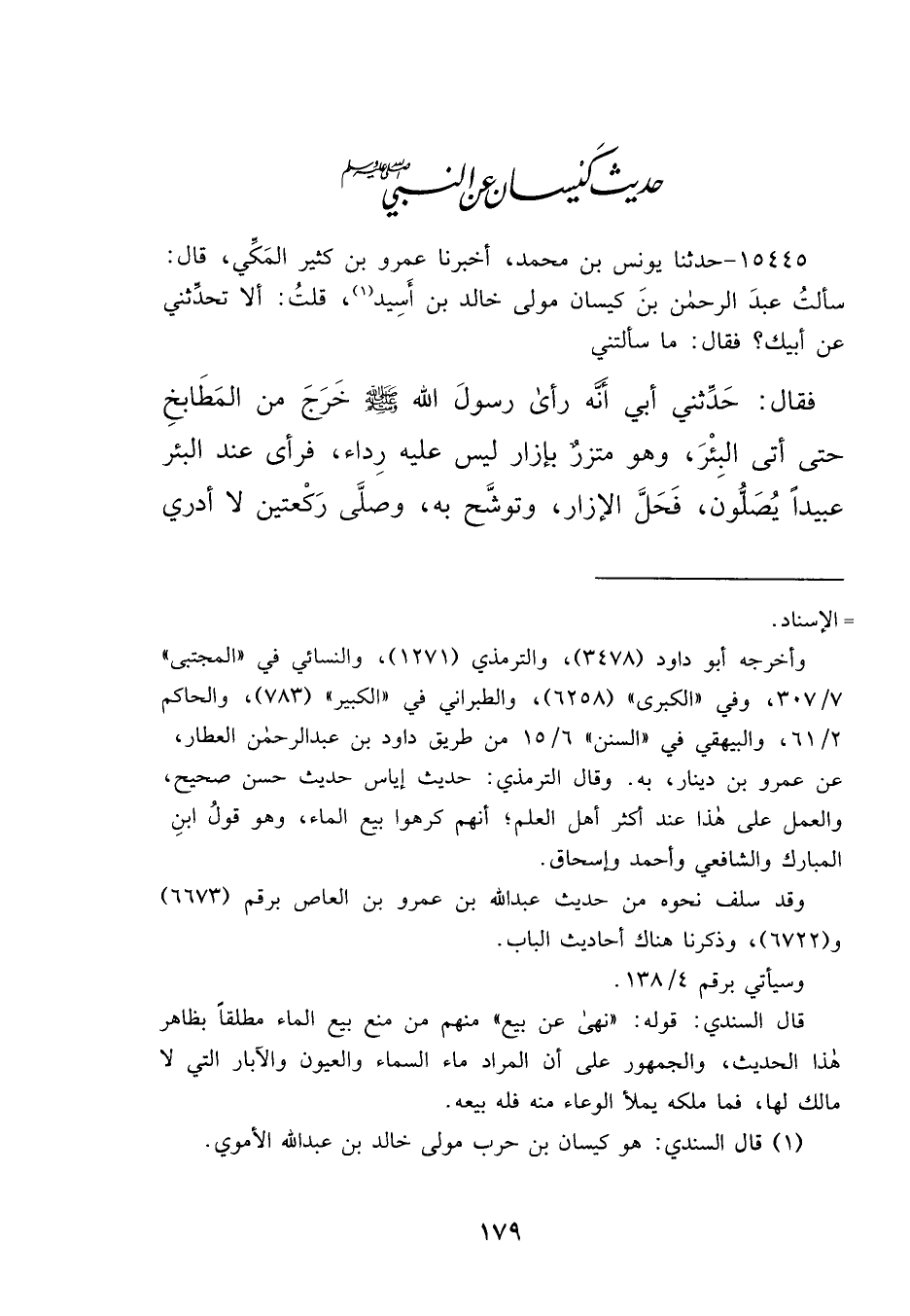 ١٥٤٤٥ - حَدَّثَنَا يُونُسُ بْنُ مُحَمَّدٍ، أَخْبَرَنَا عَمْرُو بْنُ كَثِيرٍ الْمَكِّيُّ، قَالَ: سَأَلْتُ عَبْدَ الرَّحْمَنِ بْنَ كَيْسَانَ، مَوْلَى خَالِدِ بْنِ أُسَيْدٍ، (١) قُلْتُ: أَلَا تُحَدِّثُنِي عَنْ أَبِيكَ، فَقَالَ: مَا سَأَلْتَنِي؟ فَقَالَ: حَدَّثَنِي أَبِي أَنَّهُ، " رَأَى رَسُولَ اللهِ صَلَّى اللهُ عَلَيْهِ وَسَلَّمَ خَرَجَ مِنَ الْمَطَابِخِ حَتَّى أَتَى الْبِئْرَ، وَهُوَ مُتَّزِرٌ بِإِزَارٍ لَيْسَ عَلَيْهِ رِدَاءٌ، فَرَأَى عِنْدَ الْبِئْرِ عَبِيدًا يُصَلُّونَ فَحَلَّ الْإِزَارَ، وَتَوَشَّحَ بِهِ، وَصَلَّى رَكْعَتَيْنِ لَا أَدْرِي