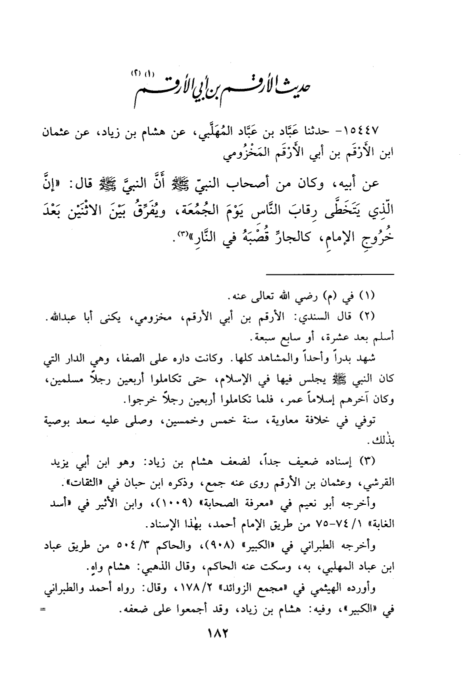 ١٥٤٤٧ - حَدَّثَنَا عَبَّادُ بْنُ عَبَّادٍ الْمُهَلَّبِيُّ، عَنْ هِشَامِ بْنِ زِيَادٍ، عَنْ عُثْمَانَ بْنِ الْأَرْقَمِ بْنِ أَبِي الْأَرْقَمِ الْمَخْزُومِيِّ، عَنْ أَبِيهِ، وَكَانَ مِنْ أَصْحَابِ النَّبِيِّ صَلَّى اللهُ عَلَيْهِ وَسَلَّمَ، أَنَّ النَّبِيَّ صَلَّى اللهُ عَلَيْهِ وَسَلَّمَ قَالَ: " " إِنَّ الَّذِي يَتَخَطَّى رِقَابَ النَّاسِ يَوْمَ الْجُمُعَةِ، وَيُفَرِّقُ بَيْنَ الِاثْنَيْنِ بَعْدَ خُرُوجِ الْإِمَامِ كَالْجَارِّ قُصْبَهُ فِي النَّارِ " " (٣)