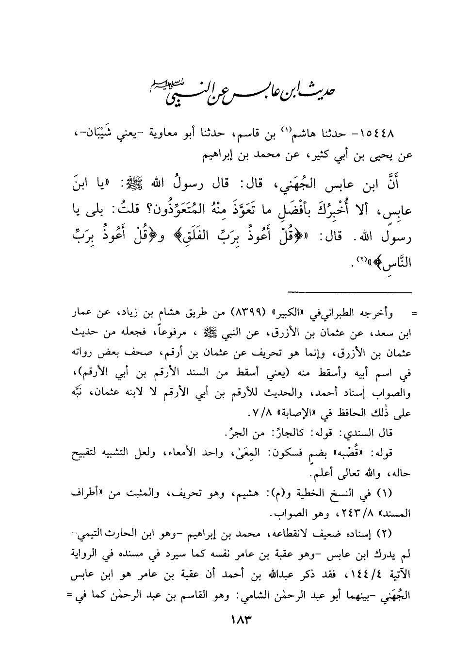 ١٥٤٤٨ - حَدَّثَنَا هَاشِمُ (١) بْنُ قَاسِمٍ، حَدَّثَنَا أَبُو مُعَاوِيَةَ يَعْنِي شَيْبَانَ، عَنْ يَحْيَى بْنِ أَبِي كَثِيرٍ، عَنْ مُحَمَّدِ بْنِ إِبْرَاهِيمَ، أَنَّ ابْنَ عَابِسٍ الْجُهَنِيَّ، قَالَ: قَالَ رَسُولُ اللهِ صَلَّى اللهُ عَلَيْهِ وَسَلَّمَ: " يَا ابْنَ عَابِسٍ أَلَا أُخْبِرُكَ بِأَفْضَلِ مَا تَعَوَّذَ َمِنْهُ الْمُتَعَوِّذُونَ؟ " قُلْتُ: بَلَى يَا رَسُولَ اللهِ، قَالَ: " قُلْ أَعُوذُ بِرَبِّ الْفَلَقِ، وَقُلْ أَعُوذُ بِرَبِّ النَّاسِ " (٢)