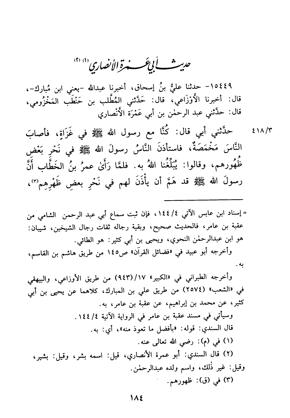 ١٥٤٤٩ - حَدَّثَنَا عَلِيُّ بْنُ إِسْحَاقَ، أَخْبَرَنَا عَبْدُ اللهِ يَعْنِي ابْنَ مُبَارَكٍ، قَالَ: أَخْبَرَنَا الْأَوْزَاعِيُّ، قَالَ: حَدَّثَنِي الْمُطَّلِبُ بْنُ حَنْطَبٍ الْمَخْزُومِيُّ، قَالَ: حَدَّثَنِي عَبْدُ الرَّحْمَنِ بْنُ أَبِي عَمْرَةَ الْأَنْصَارِيُّ، حَدَّثَنِي أَبِي قَالَ: كُنَّا مَعَ رَسُولِ اللهِ صَلَّى اللهُ عَلَيْهِ وَسَلَّمَ فِي غَزَاةٍ، فَأَصَابَ النَّاسَ مَخْمَصَةٌ، فَاسْتَأْذَنَ النَّاسُ رَسُولَ اللهِ صَلَّى اللهُ عَلَيْهِ وَسَلَّمَ فِي نَحْرِ بَعْضِ ظُهُورِهِمْ، وَقَالُوا: يُبَلِّغُنَا اللهُ بِهِ، فَلَمَّا رَأَى عُمَرُ بْنُ الْخَطَّابِ أَنَّ رَسُولَ اللهِ صَلَّى اللهُ عَلَيْهِ وَسَلَّمَ قَدْ هَمَّ أَنْ يَأْذَنَ لَهُمْ فِي نَحْرِ بَعْضِ ظَهْرِهِمْ، (٣)