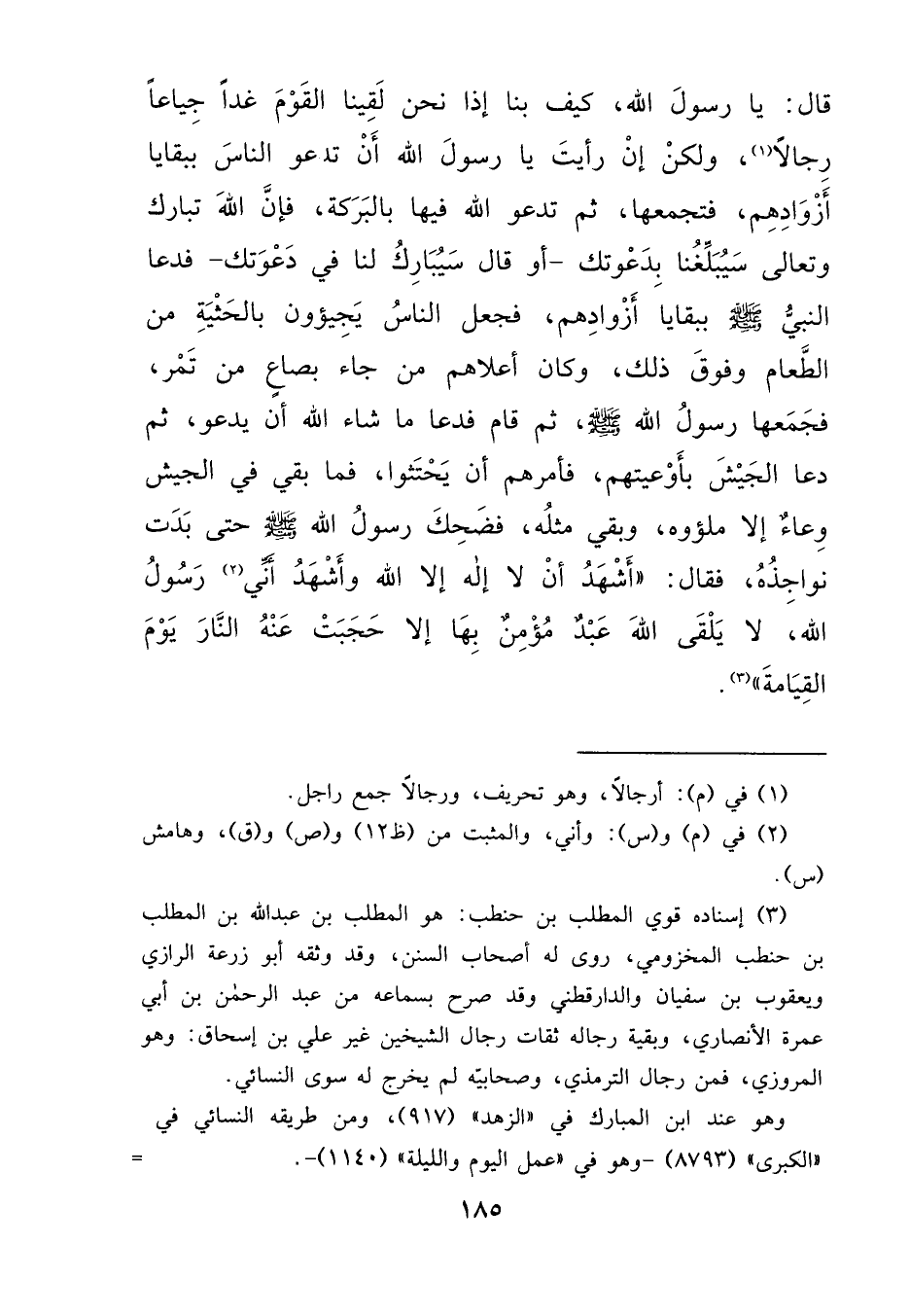 قَالَ: يَا رَسُولَ اللهِ، كَيْفَ بِنَا إِذَا نَحْنُ لَقِينَا الْقَوْمَ غَدًا جِيَاعًا رِجَالًا؟ (١) وَلَكِنْ إِنْ رَأَيْتَ يَا رَسُولَ اللهِ أَنْ تَدْعُوَ لَنَا بِبَقَايَا أَزْوَادِهِمْ فَتَجْمَعَهَا، ثُمَّ تَدْعُوَ اللهَ فِيهَا بِالْبَرَكَةِ، فَإِنَّ اللهَ تَبَارَكَ وَتَعَالَى سَيُبَلِّغُنَا بِدَعْوَتِكَ - أَوْ قَالَ: سَيُبَارِكُ لَنَا فِي دَعْوَتِكَ - فَدَعَا النَّبِيُّ صَلَّى اللهُ عَلَيْهِ وَسَلَّمَ بِبَقَايَا أَزْوَادِهِمْ، فَجَعَلَ النَّاسُ يُجِيئُونَ بِالْحَثْيَةِ مِنَ الطَّعَامِ، وَفَوْقَ ذَلِكَ، وَكَانَ أَعْلَاهُمْ مَنْ جَاءَ بِصَاعٍ مِنْ تَمْرٍ، فَجَمَعَهَا رَسُولُ اللهِ صَلَّى اللهُ عَلَيْهِ وَسَلَّمَ، ثُمَّ قَامَ فَدَعَا مَا شَاءَ اللهُ أَنْ يَدْعُوَ، ثُمَّ دَعَا الْجَيْشَ بِأَوْعِيَتِهِمْ، فَأَمَرَهُمْ أَنْ يَحْتَثُوا، فَمَا بَقِيَ فِي الْجَيْشِ وِعَاءٌ إِلَّا مَلَئُوهُ، وَبَقِيَ مِثْلُهُ، فَضَحِكَ رَسُولُ اللهِ صَلَّى اللهُ عَلَيْهِ وَسَلَّمَ حَتَّى بَدَتْ نَوَاجِذُهُ، فَقَالَ: " أَشْهَدُ أَنْ لَا إِلَهَ إِلَّا اللهُ، وَأَشْهَدُ أَنِّي (٢) رَسُولُ اللهِ، لَا يَلْقَى اللهَ عَبْدٌ مُؤْمِنٌ بِهَا إِلَّا حُجِبَتْ عَنْهُ النَّارُ يَوْمَ الْقِيَامَةِ " (٣)