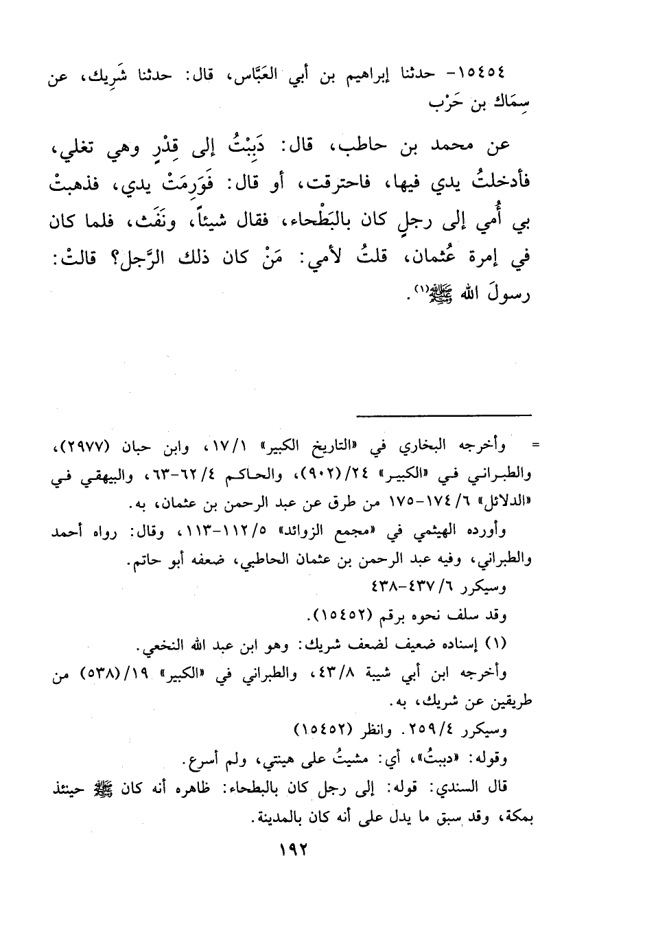 ١٥٤٥٤ - حَدَّثَنَا إِبْرَاهِيمُ بْنُ أَبِي الْعَبَّاسِ، قَالَ: حَدَّثَنَا شَرِيكٌ، عَنْ سِمَاكِ بْنِ حَرْبٍ، عَنْ مُحَمَّدِ بْنِ حَاطِبٍ، قَالَ: دَبَبْتُ إِلَى قِدْرٍ، وَهِيَ تَغْلِي فَأَدْخَلْتُ يَدِي فِيهَا، فَاحْتَرَقَتْ - أَوْ قَالَ: فَوَرِمَتْ يَدِي - فَذَهَبَتْ بِي أُمِّي إِلَى رَجُلٍ كَانَ بِالْبَطْحَاءِ، فَقَالَ شَيْئًا، وَنَفَثَ "، فَلَمَّا كَانَ فِي إِمْرَةِ عُثْمَانَ، قُلْتُ لِأُمِّي مَنْ كَانَ ذَلِكَ الرَّجُلُ؟ قَالَتْ: رَسُولَ اللهِ صَلَّى اللهُ عَلَيْهِ وَسَلَّمَ (١)