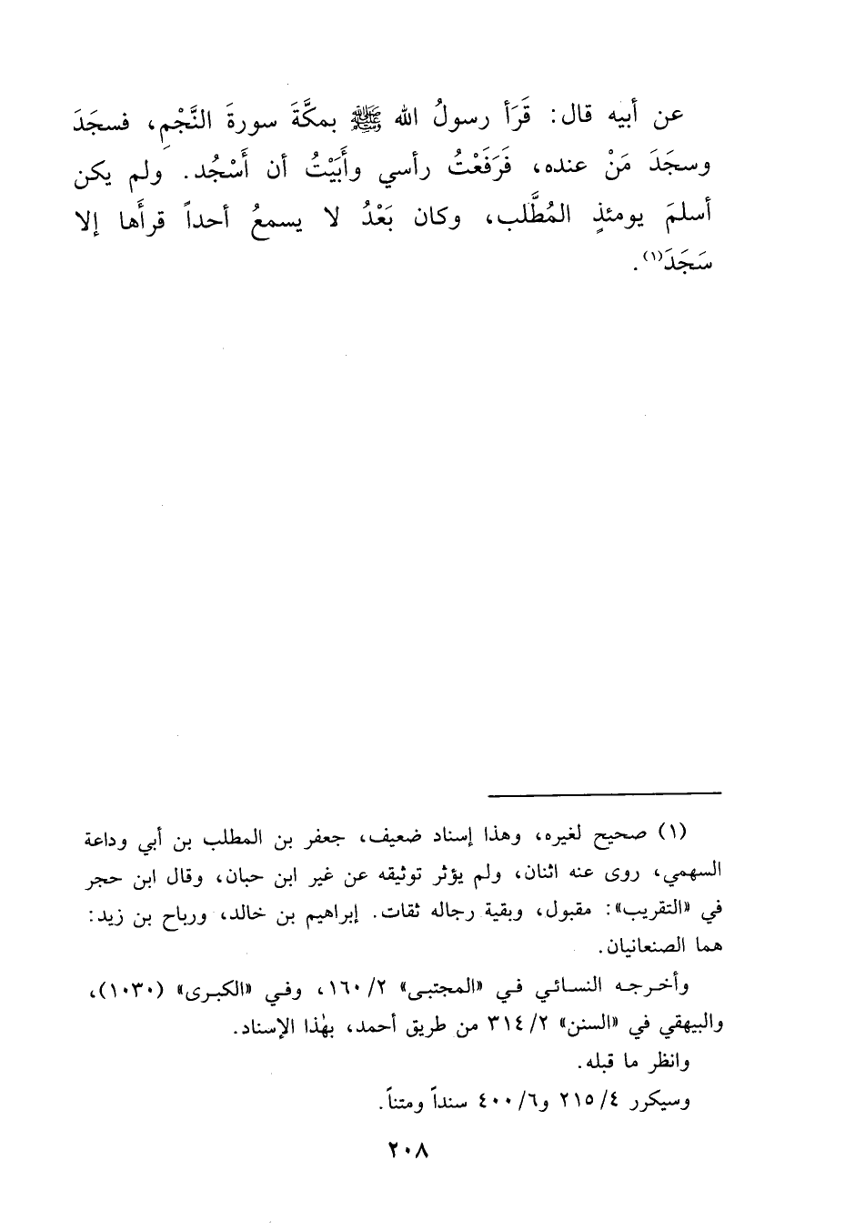 عَنْ أَبِيهِ، قَالَ: " " قَرَأَ رَسُولُ اللهِ صَلَّى اللهُ عَلَيْهِ وَسَلَّمَ بِمَكَّةَ سُورَةَ النَّجْمِ فَسَجَدَ وَسَجَدَ مَنْ عِنْدَهُ " " " " فَرَفَعْتُ رَأْسِي، وَأَبَيْتُ أَنْ أَسْجُدَ، وَلَمْ يَكُنْ أَسْلَمَ يَوْمَئِذٍ الْمُطَّلِبُ، وَكَانَ بَعْدُ لَا يَسْمَعُ أَحَدًا قَرَأَهَا إِلَّا سَجَدَ " " (١)