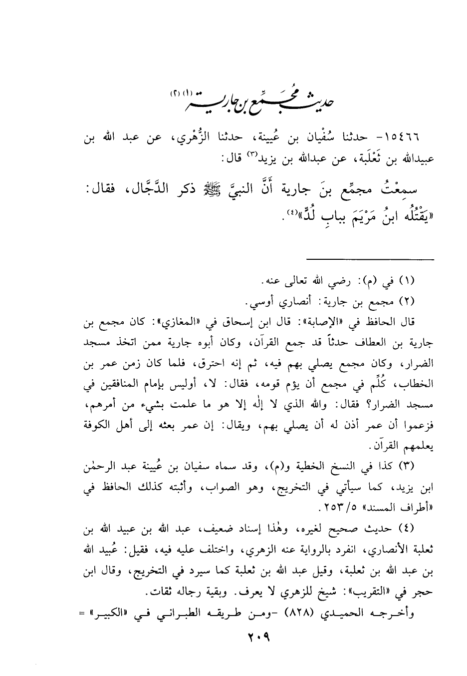١٥٤٦٦ - حَدَّثَنَا سُفْيَانُ بْنُ عُيَيْنَةَ، حَدَّثَنَا الزُّهْرِيُّ، عَنْ عَبْدِ اللهِ بْنِ عُبَيْدِ اللهِ بْنِ ثَعْلَبَةَ، عَنْ عَبْدِ الرَّحْمَنِ بْنِ يَزِيدَ، (٣) قَالَ: سَمِعْتُ مُجَمِّعَ ابْنَ جَارِيَةَ، أَنَّ النَّبِيَّ صَلَّى اللهُ عَلَيْهِ وَسَلَّمَ ذَكَرَ الدَّجَّالَ، فَقَالَ: " يَقْتُلُهُ ابْنُ مَرْيَمَ بِبَابِ لُدٍّ " (٤)