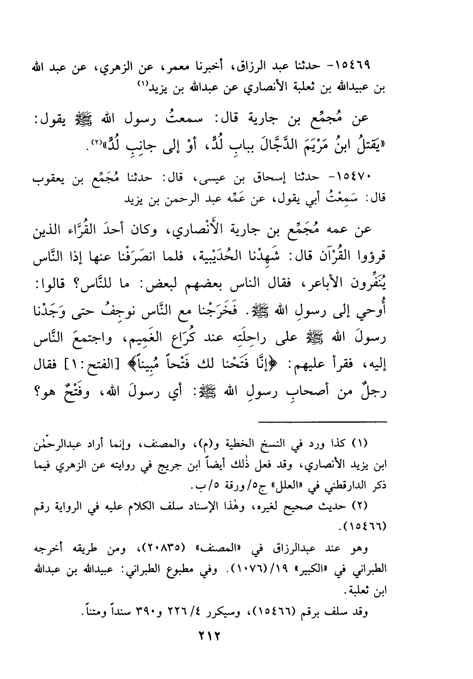 ١٥٤٦٩ - حَدَّثَنَا عَبْدُ الرَّزَّاقِ، أَخْبَرَنَا مَعْمَرٌ، عَنِ الزُّهْرِيِّ، عَنْ عَبْدِ اللهِ بْنِ عُبَيْدِ اللهِ بْنِ ثَعْلَبَةَ الْأَنْصَارِيِّ، عَنْ عَبْدِ الرَّحْمَنِ بْنِ يَزِيدَ، (١) عَنْ مُجَمِّعِ ابْنِ جَارِيَةَ، قَالَ: سَمِعْتُ رَسُولَ اللهِ صَلَّى اللهُ عَلَيْهِ وَسَلَّمَ يَقُولُ: " يَقْتُلُ ابْنُ مَرْيَمَ الدَّجَّالَ بِبَابِ لُدٍّ - أَوْ إِلَى جَانِبِ لُدٍّ - " (٢)