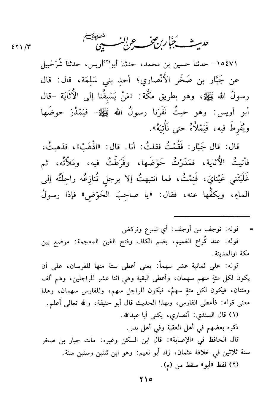 ١٥٤٧١ - حَدَّثَنَا حُسَيْنُ بْنُ مُحَمَّدٍ، حَدَّثَنَا أَبُو (١) أُوَيْسٍ، حَدَّثَنَا شُرَحْبِيلٌ، عَنْ جَبَّارِ بْنِ صَخْرٍ الْأَنْصَارِيِّ، أَحَدِ بَنِي سَلِمَةَ، قَالَ: قَالَ رَسُولُ اللهِ صَلَّى اللهُ عَلَيْهِ وَسَلَّمَ وَهُوَ بِطَرِيقِ مَكَّةَ: " مَنْ يَسْبِقُنَا إِلَى الْأُثَايَةِ؟ - قَالَ: أَبُو أُوَيْسٍ: هُوَ حَيْثُ نَفَّرَنَا رَسُولُ اللهِ صَلَّى اللهُ عَلَيْهِ وَسَلَّمَ - فَيَمْدُرَ حَوْضَهَا، وَيَفْرِطَ فِيهِ، فَيَمْلَأَهُ حَتَّى نَأْتِيَهُ " قَالَ: قَالَ جَبَّارٌ: فَقُمْتُ فَقُلْتُ: أَنَا، قَالَ " اذْهَبْ " فَذَهَبْتُ فَأَتَيْتُ الْأُثَايَةَ فَمَدَرْتُ حَوْضَهَا، وَفَرَطْتُ فِيهِ، وَمَلَأْتُهُ، ثُمَّ غَلَبَتْنِي عَيْنَايَ فَنِمْتُ، فَمَا انْتَبَهْتُ إِلَّا بِرَجُلٍ تُنَازِعُهُ رَاحِلَتُهُ إِلَى الْمَاءِ، وَيَكُفُّهَا عَنْهُ، فَقَالَ: " يَا صَاحِبَ الْحَوْضِ " فَإِذَا رَسُولُ