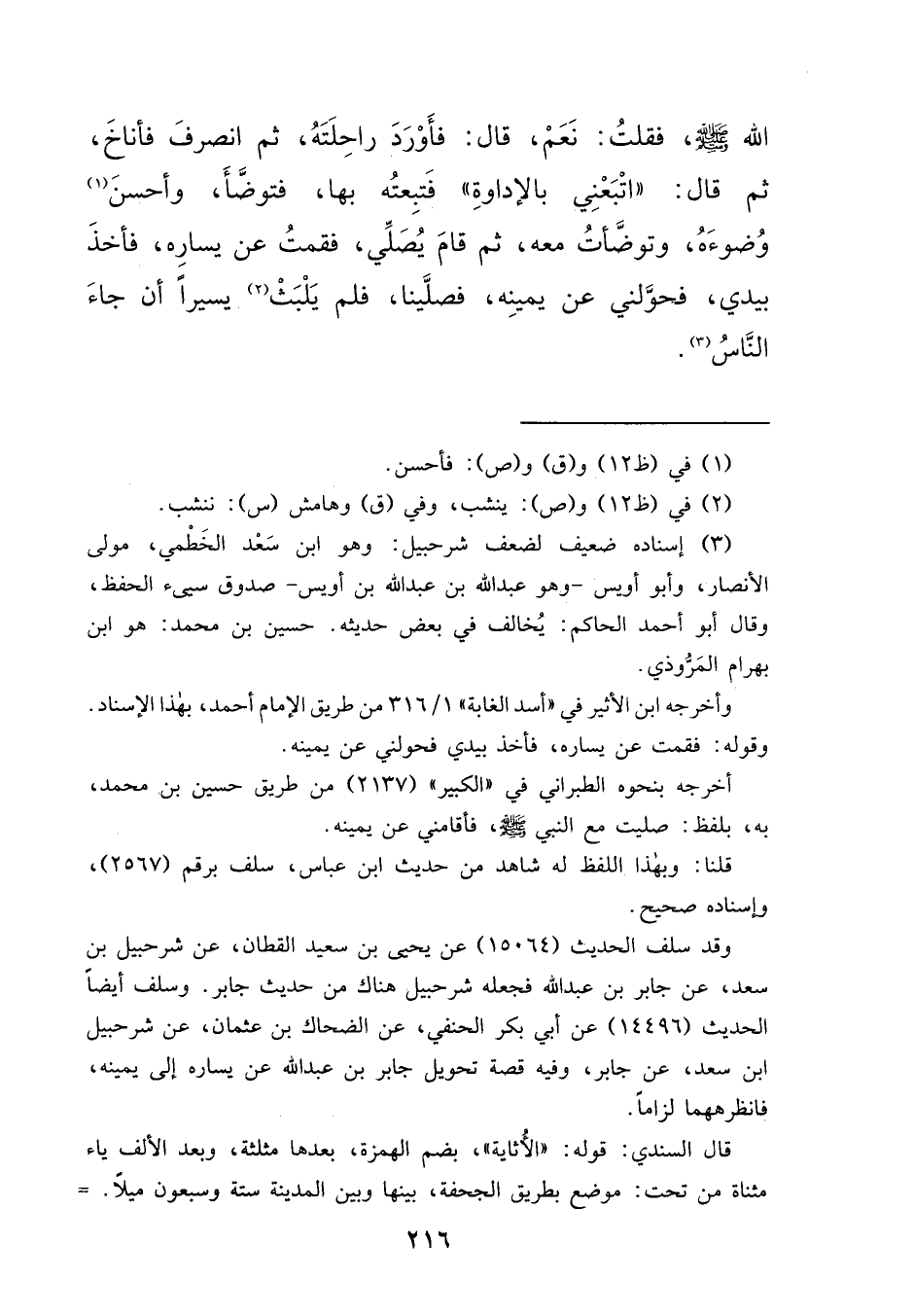 اللهِ صَلَّى اللهُ عَلَيْهِ وَسَلَّمَ فَقُلْتُ: نَعَمْ، قَالَ: فَأَوْرَدَ رَاحِلَتَهُ، ثُمَّ انْصَرَفَ، فَأَنَاخَ ثُمَّ قَالَ: " اتْبَعْنِي بِالْإِدَاوَةِ " فَتَبِعْتُهُ بِهَا فَتَوَضَّأَ وَأَحْسَنَ (١) وُضُوءَهُ، وَتَوَضَّأْتُ مَعَهُ ثُمَّ قَامَ يُصَلِّي، فَقُمْتُ عَنْ يَسَارِهِ فَأَخَذَ بِيَدِي فَحَوَّلَنِي عَنْ يَمِينِهِ فَصَلَّيْنَا، فَلَمْ يَلْبَثْ (٢) يَسِيرًا أَنْ جَاءَ النَّاسُ (٣)