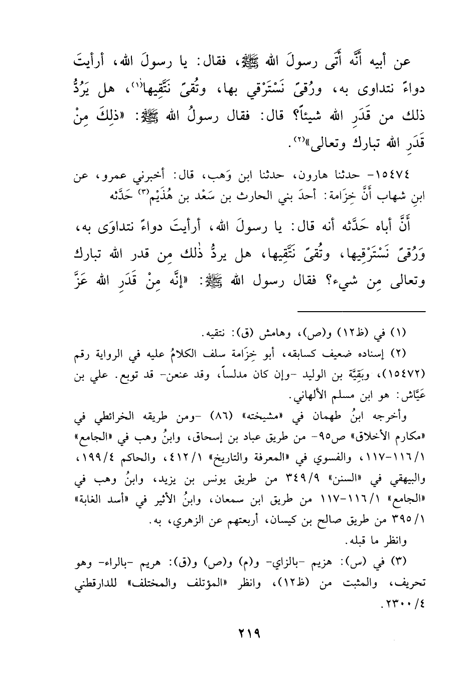 ١٥٤٧٤ - حَدَّثَنَا هَارُونُ، حَدَّثَنَا ابْنُ وَهْبٍ قَالَ: أَخْبَرَنِي عَمْرٌو، عَنِ ابْنِ شِهَابٍ، أَنَّ ابْنَ أَبِي خُزَامَةَ، أَحَدَ بَنِي الْحَارِثِ بْنِ سَعْدِ بْنِ هُذَيْمٍ (٣) حَدَّثَهُ: أَنَّ أَبَاهُ حَدَّثَهُ، أَنَّهُ قَالَ: يَا رَسُولَ اللهِ، أَرَأَيْتَ دَوَاءً نَتَدَاوَى بِهِ، وَرُقًى نَسْتَرْقِيهَا، وَتُقًى نَتَّقِيهَا، هَلْ يَرُدُّ ذَلِكَ مِنْ قَدَرِ اللهِ تَبَارَكَ وَتَعَالَى مِنْ شَيْءٍ؟ فَقَالَ رَسُولُ اللهِ صَلَّى اللهُ عَلَيْهِ وَسَلَّمَ: " إِنَّهُ مِنْ قَدَرِ اللهِ عَزَّ