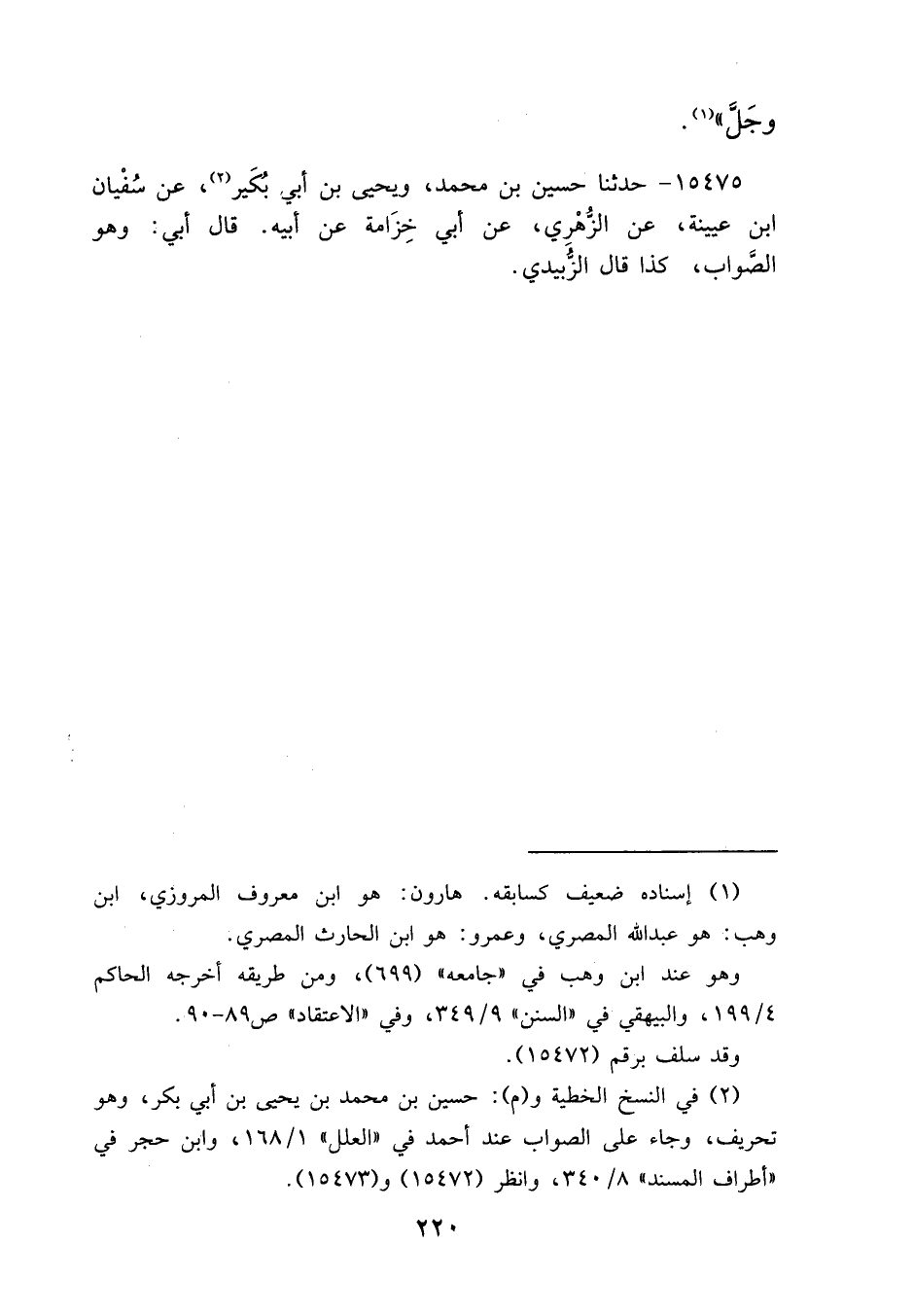 ١٥٤٧٥ - حَدَّثَنَا حُسَيْنُ بْنُ مُحَمَّدٍ، وَيَحْيَى بْنِ أَبِي بُكَيْرٍ (٢) ، عَنْ سُفْيَانَ بْنِ عُيَيْنَةَ، عَنِ الزُّهْرِيِّ، عَنْ ابْنِ أَبِي خُزَامَةَ، عَنْ أَبِيهِ، قَالَ أَبِي: " وَهُوَ الصَّوَابُ كَذَا قَالَ الزُّبَيْدِيُّ "