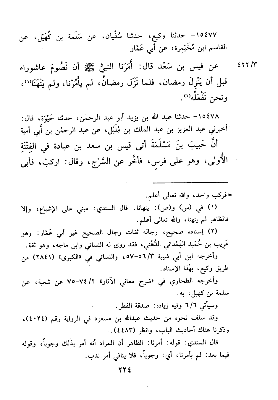 ١٥٤٧٧ - حَدَّثَنَا وَكِيعٌ، حَدَّثَنَا سُفْيَانُ، عَنْ سَلَمَةَ بْنِ كُهَيْلٍ، عَنِ الْقَاسِمِ ابْنِ مُخَيْمِرَةَ، عَنْ أَبِي عَمَّارٍ، عَنْ قَيْسِ بْنِ سَعْدٍ، قَالَ: " أَمَرَنَا النَّبِيُّ صَلَّى اللهُ عَلَيْهِ وَسَلَّمَ أَنْ نَصُومَ عَاشُورَاءَ قَبْلَ أَنْ يَنْزِلَ صِيَامُ رَمَضَانَ، فَلَمَّا نَزَلَ صِيَامُ رَمَضَانَ لَمْ يَأْمُرْنَا، وَلَمْ يَنْهَنَا (١) وَنَحْنُ نَفْعَلُهُ " (٢)