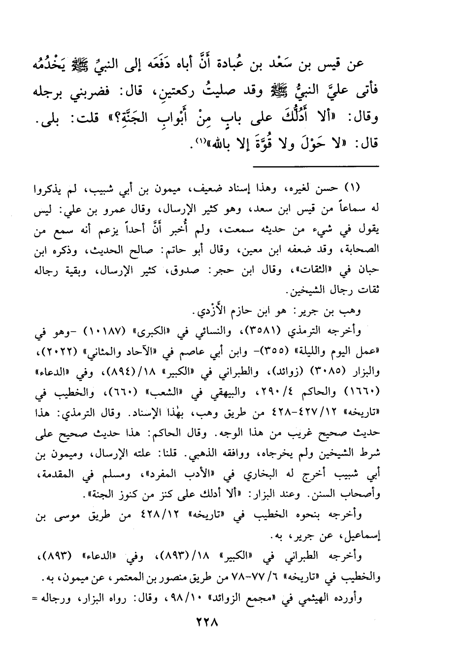 عَنْ قَيْسِ بْنِ سَعْدِ بْنِ عُبَادَةَ، أَنَّ أَبَاهُ دَفَعَهُ إِلَى النَّبِيِّ صَلَّى اللهُ عَلَيْهِ وَسَلَّمَ يَخْدُمُهُ، فَأَتَى عَلَيَّ النَّبِيُّ صَلَّى اللهُ عَلَيْهِ وَسَلَّمَ وَقَدْ صَلَّيْتُ رَكْعَتَيْنِ، قَالَ: فَضَرَبَنِي بِرِجْلِهِ، وَقَالَ: " أَلَا أَدُلُّكَ عَلَى بَابٍ مِنْ أَبْوَابِ الْجَنَّةِ؟ " قُلْتُ: بَلَى، قَالَ: " لَا حَوْلَ وَلَا قُوَّةَ إِلَّا بِاللهِ " (١)