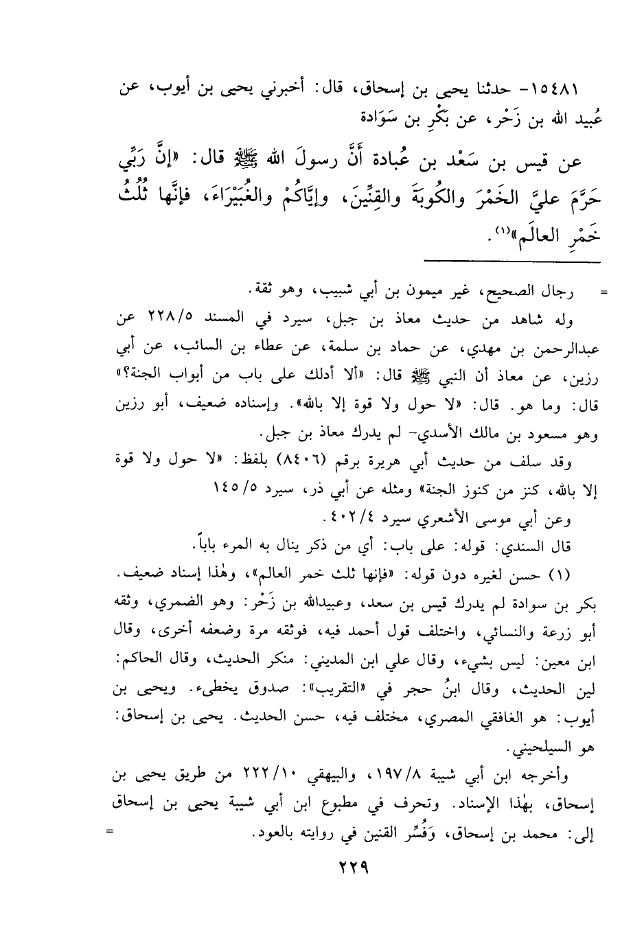 ١٥٤٨١ - حَدَّثَنَا يَحْيَى بْنُ إِسْحَاقَ، قَالَ: أَخْبَرَنِي يَحْيَى بْنُ أَيُّوبَ، عَنْ عُبَيْدِ اللهِ بْنِ زَحْرٍ، عَنْ بَكْرِ بْنِ سَوَادَةَ، عَنْ قَيْسِ بْنِ سَعْدِ بْنِ عُبَادَةَ، أَنَّ رَسُولَ اللهِ صَلَّى اللهُ عَلَيْهِ وَسَلَّمَ قَالَ: " إِنَّ رَبِّي حَرَّمَ عَلَيَّ الْخَمْرَ، وَالْكُوبَةَ، وَالْقِنِّينَ، وَإِيَّاكُمْ وَالْغُبَيْرَاءَ، فَإِنَّهَا ثُلُثُ خَمْرِ الْعَالَمِ " (١)