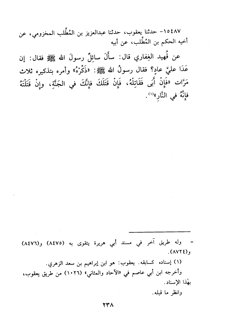١٥٤٨٧ - حَدَّثَنَا يَعْقُوبُ، حَدَّثَنَا عَبْدُ الْعَزِيزِ بْنُ الْمُطَّلِبِ الْمَخْزُومِيُّ، عَنْ أَخِيهِ الْحَكَمِ بْنِ الْمُطَّلِبِ، عَنْ أَبِيهِ، عَنْ قُهَيْدٍ الْغِفَارِيِّ، قَالَ: سَأَلَ سَائِلٌ رَسُولَ اللهِ صَلَّى اللهُ عَلَيْهِ وَسَلَّمَ فَقَالَ: إِنْ عَدَا عَلَيَّ عَادٍ؟ فَقَالَ رَسُولُ اللهِ صَلَّى اللهُ عَلَيْهِ وَسَلَّمَ: " ذَكِّرْهُ وَأَمَرَهُ بِتَذْكِيرِهِ ثَلَاثَ مَرَّاتٍ، فَإِنْ أَبَى فَقَاتِلْهُ فَإِنْ قَتَلَكَ فَإِنَّكَ فِي الْجَنَّةِ، وَإِنْ قَتَلْتَهُ فَإِنَّهُ فِي النَّارِ " (١)